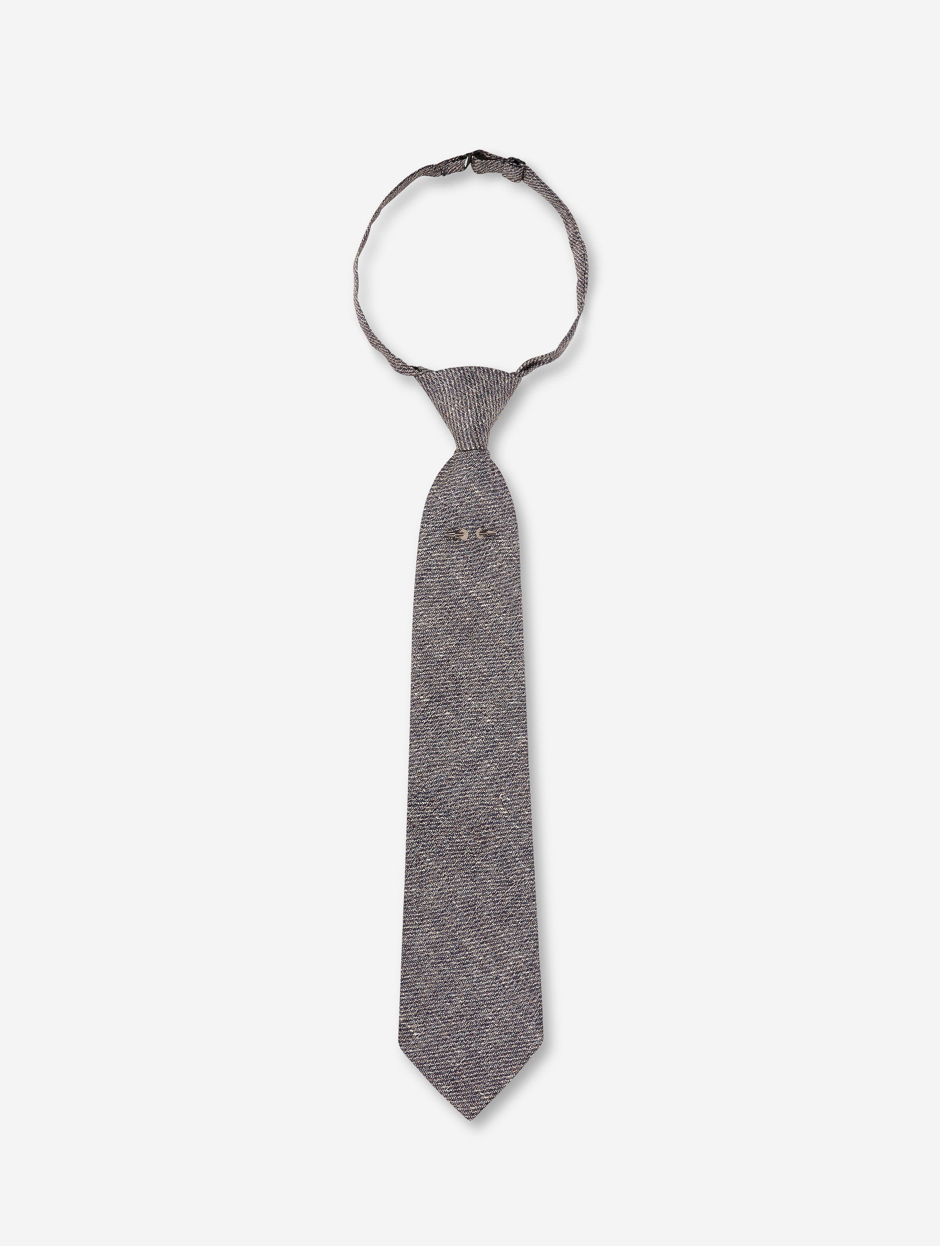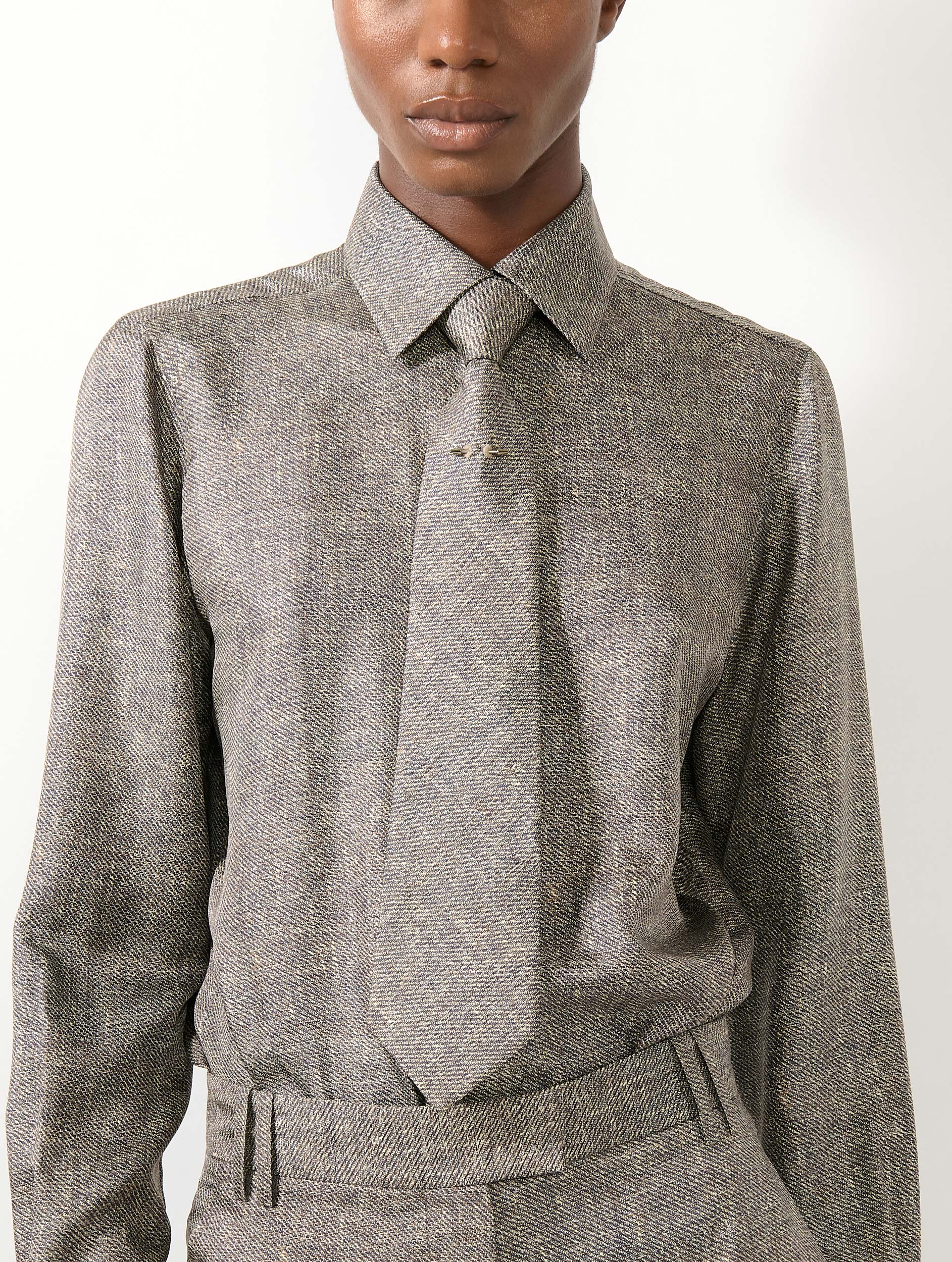 Barbara Bui seizes the tie, an accessory immediately conferring an attitude, twisted this season in an asserted tailoring spirit. Crafted in printed silk with a trompe-l'œil weave effect, this accessory plays fake classics with just the right amount of impertinence. Mounted on a neck strap and already knotted for a perfect hold, this women's tie naturally associates with the matching shirt and suit. Its silver-tone metal piercing, signature of the House, punctuates the silhouette with a rock sparkle.