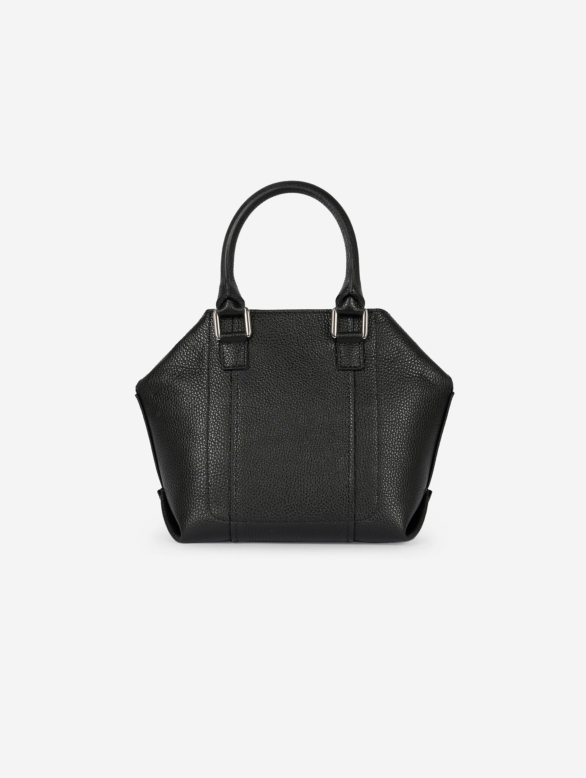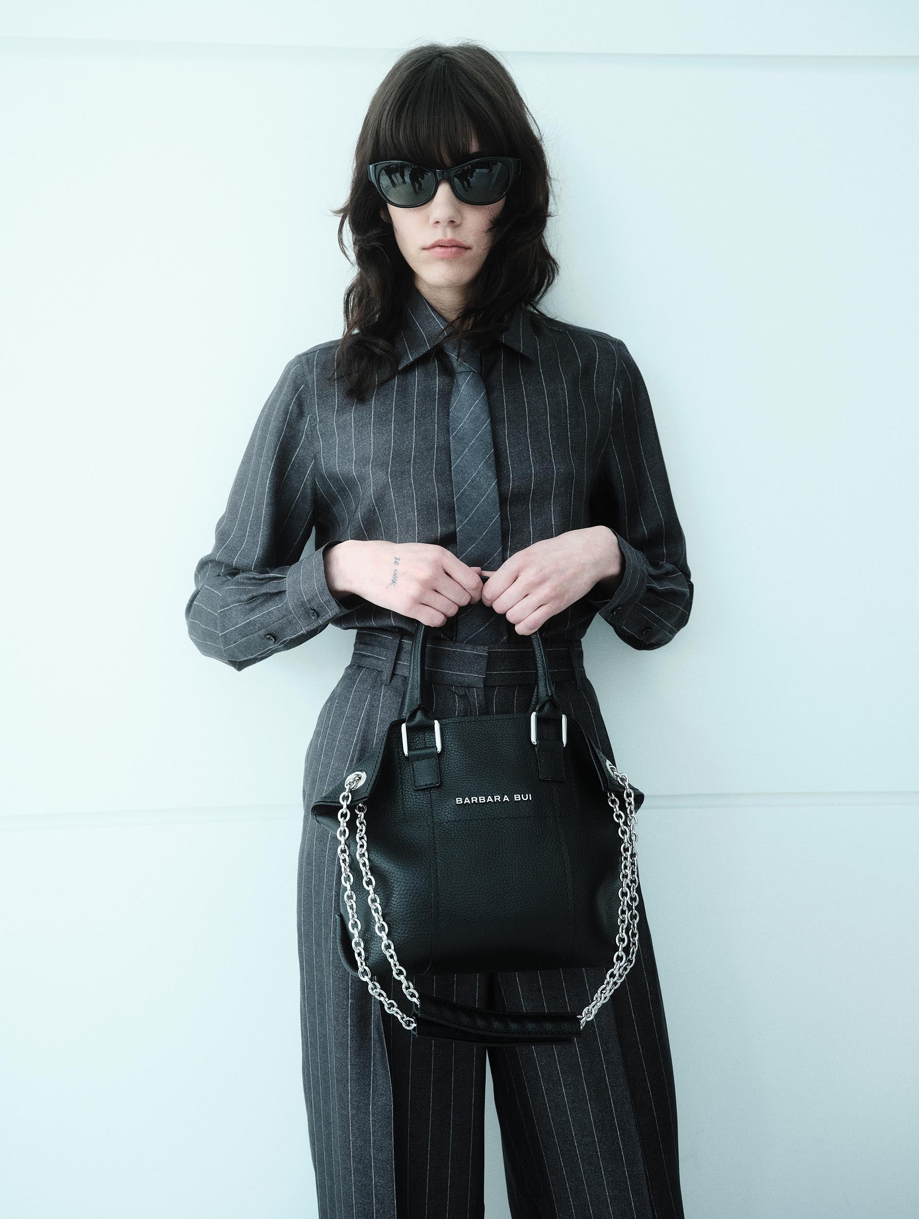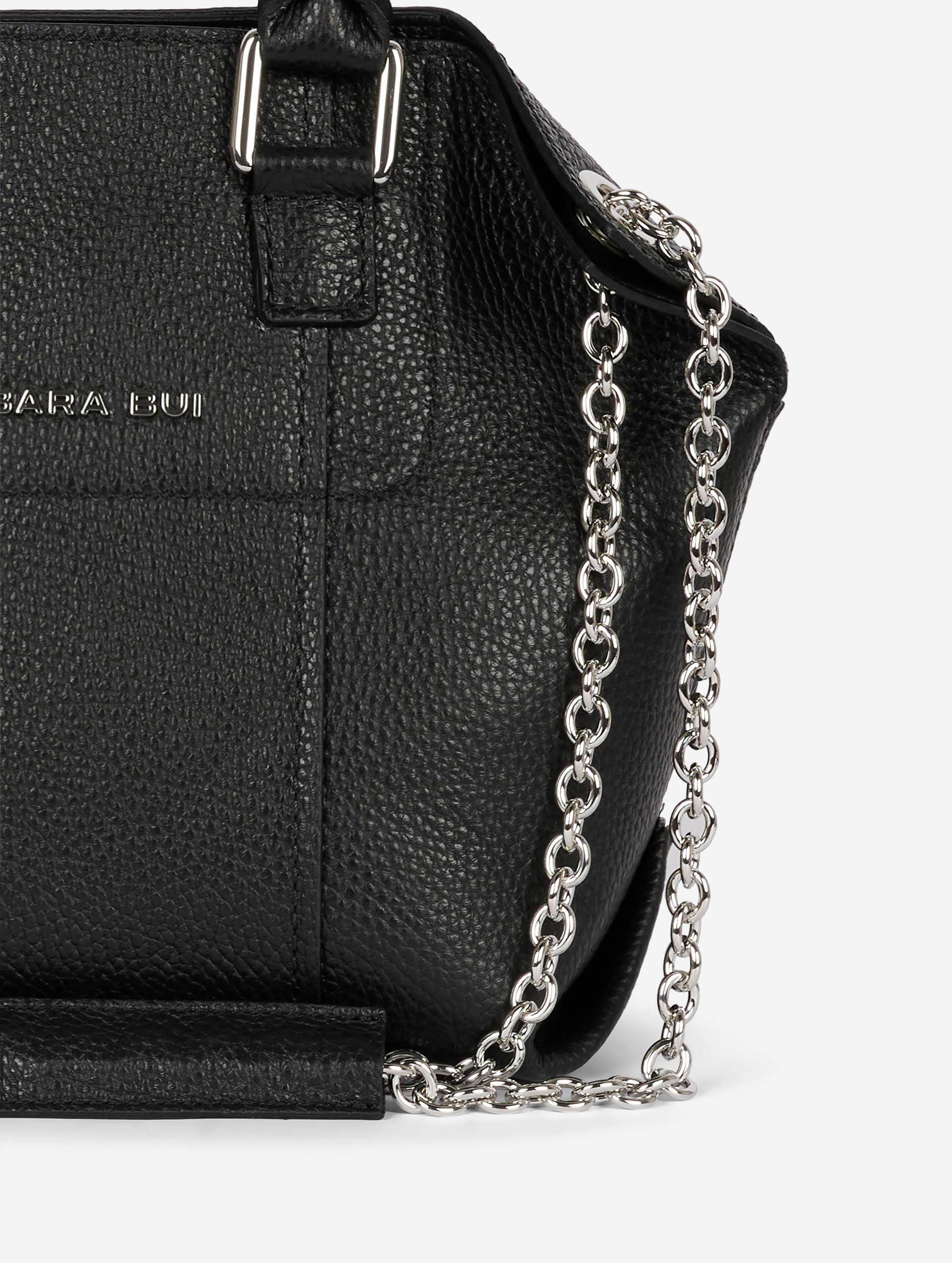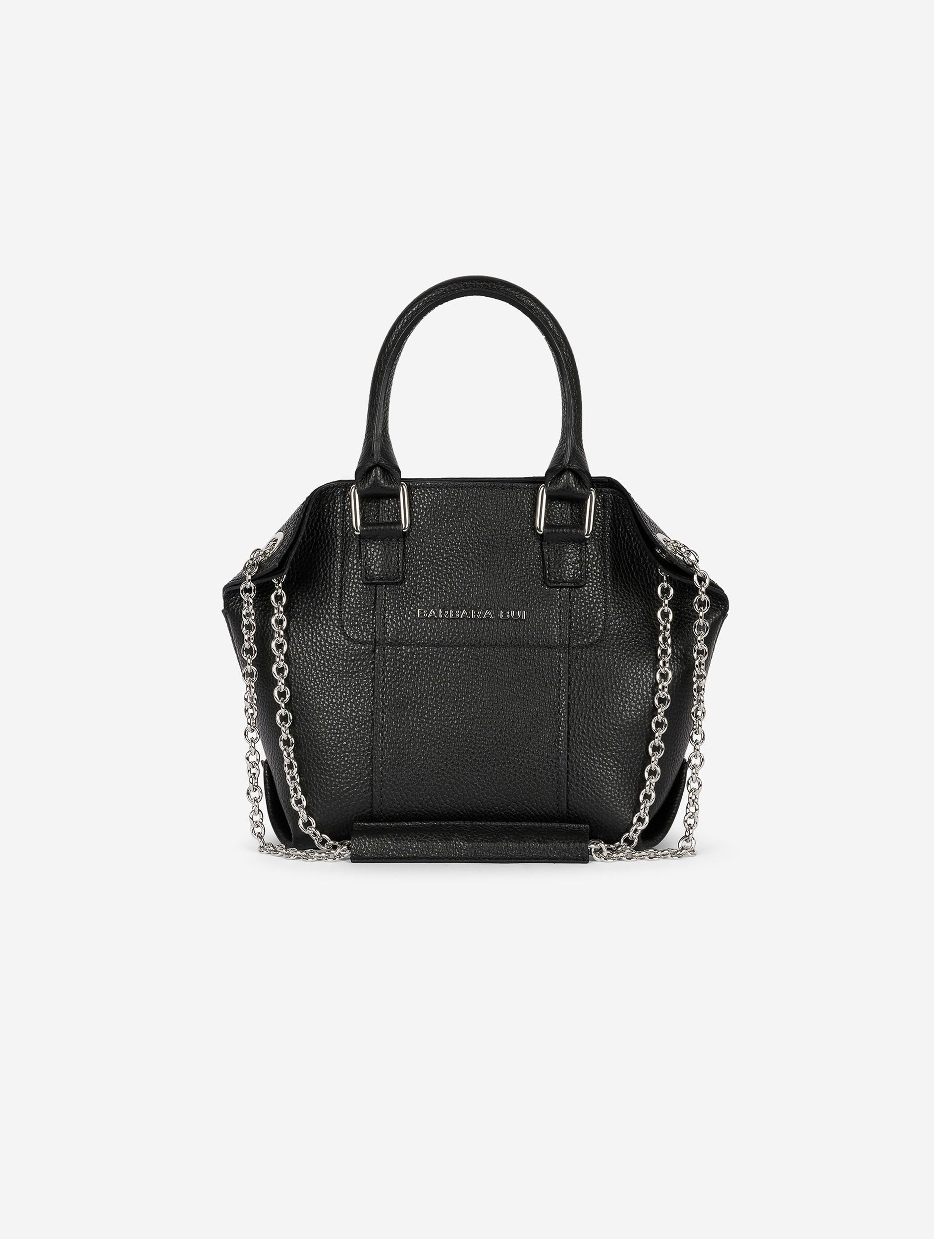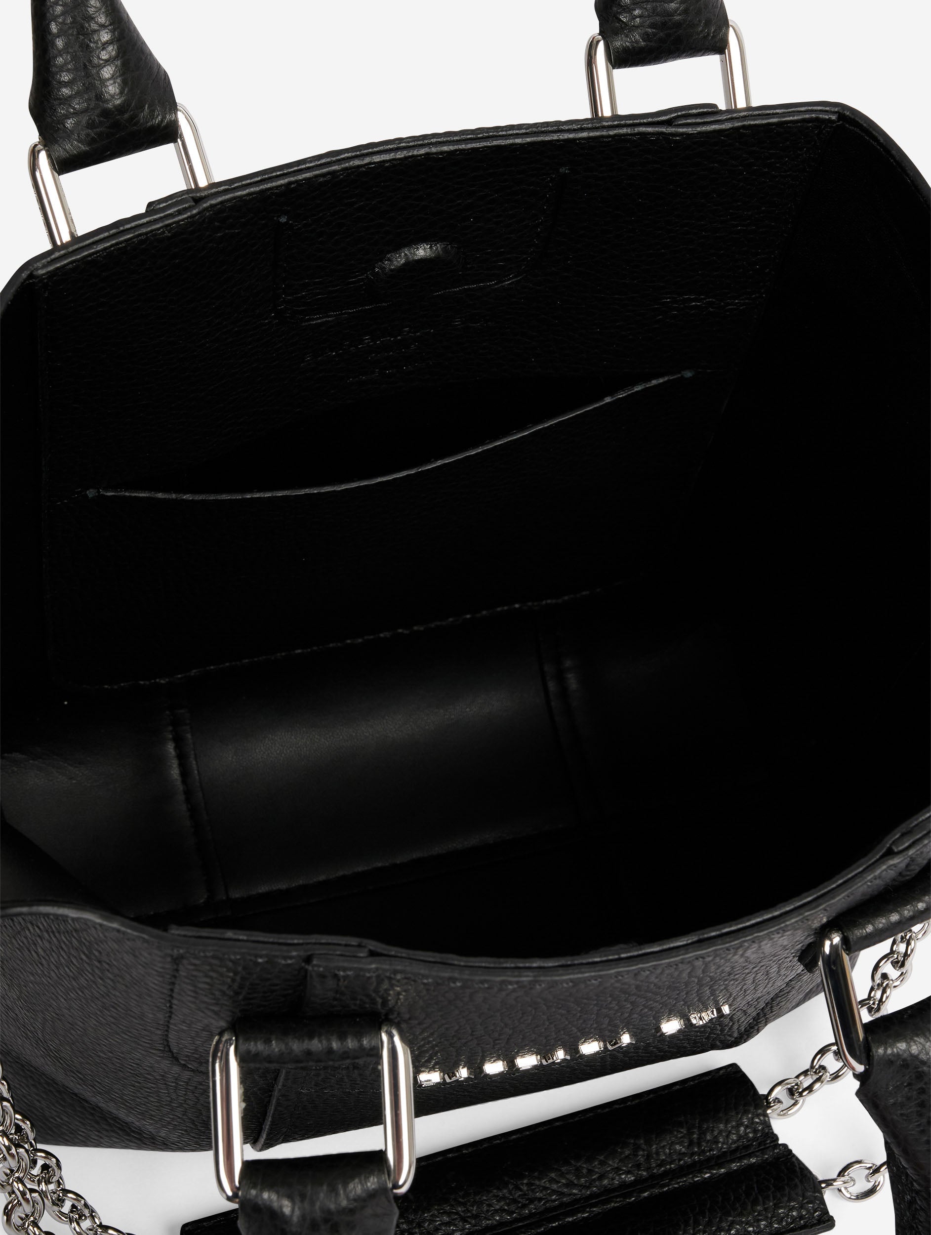 "LITTLE CHAMALLOW" small tote bag in black grained calfskin, laminated on its reversible-effect lining. Articulated hand-carry handles and sliding chain shoulder strap for either short double chain or long single chain shoulder carrying. Inside patch pocket and central magnetic closure.