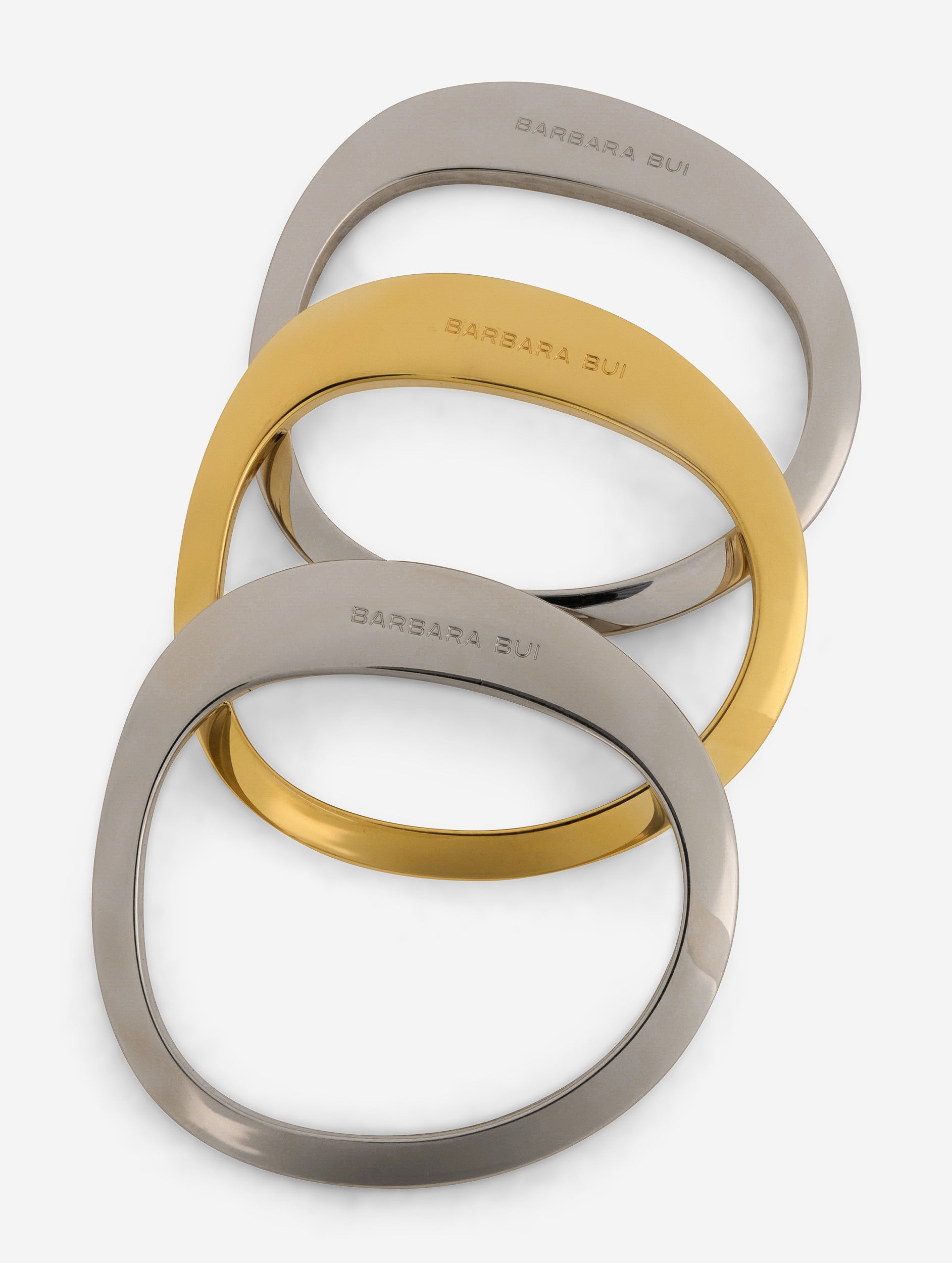 Set of 3 asymmetrical metal bangles to mix and match to your heart's content. Shown here in the 2 x silver and 1 x gold version.