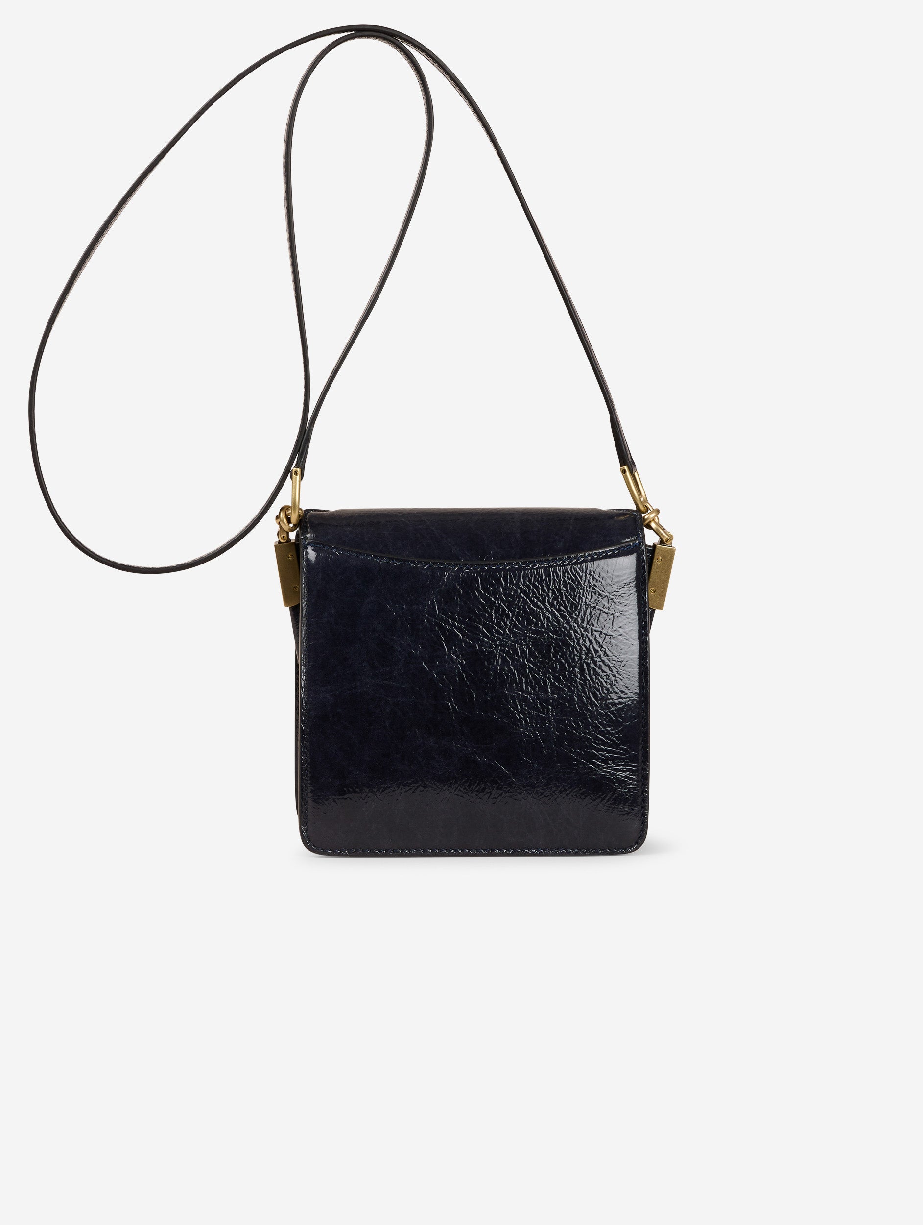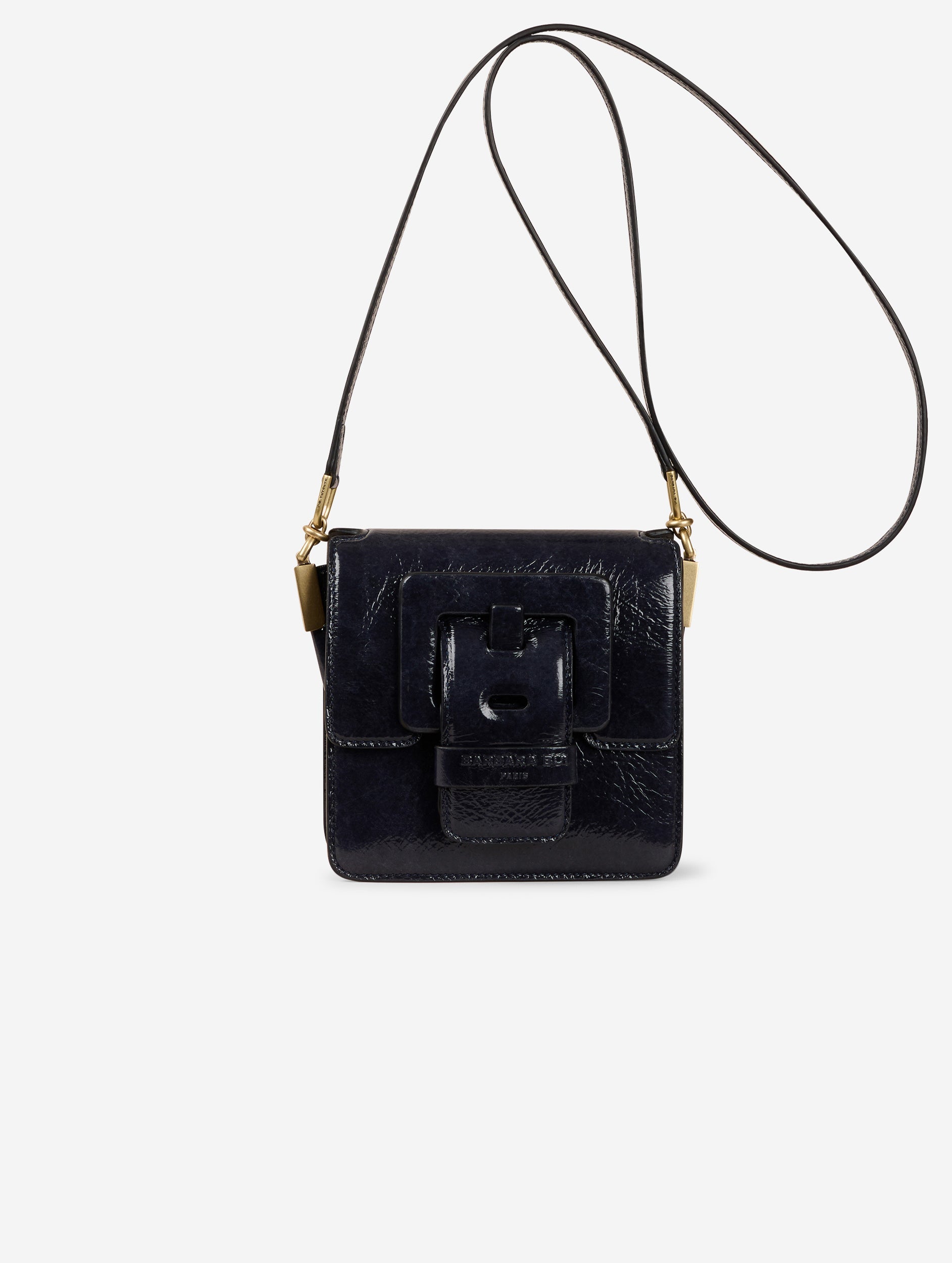 LOVE ME bag in navy blue naplak patent leather. 120 cm long narrow shoulder strap for crossbody wear. Large decorative reinforced leather buckle on the magnetic closure flap. Front pocket, back pocket to keep your smartphone handy and inside welt pocket. Height: 16cm/ Length: 16cm/ Depth: 6.5 cm.