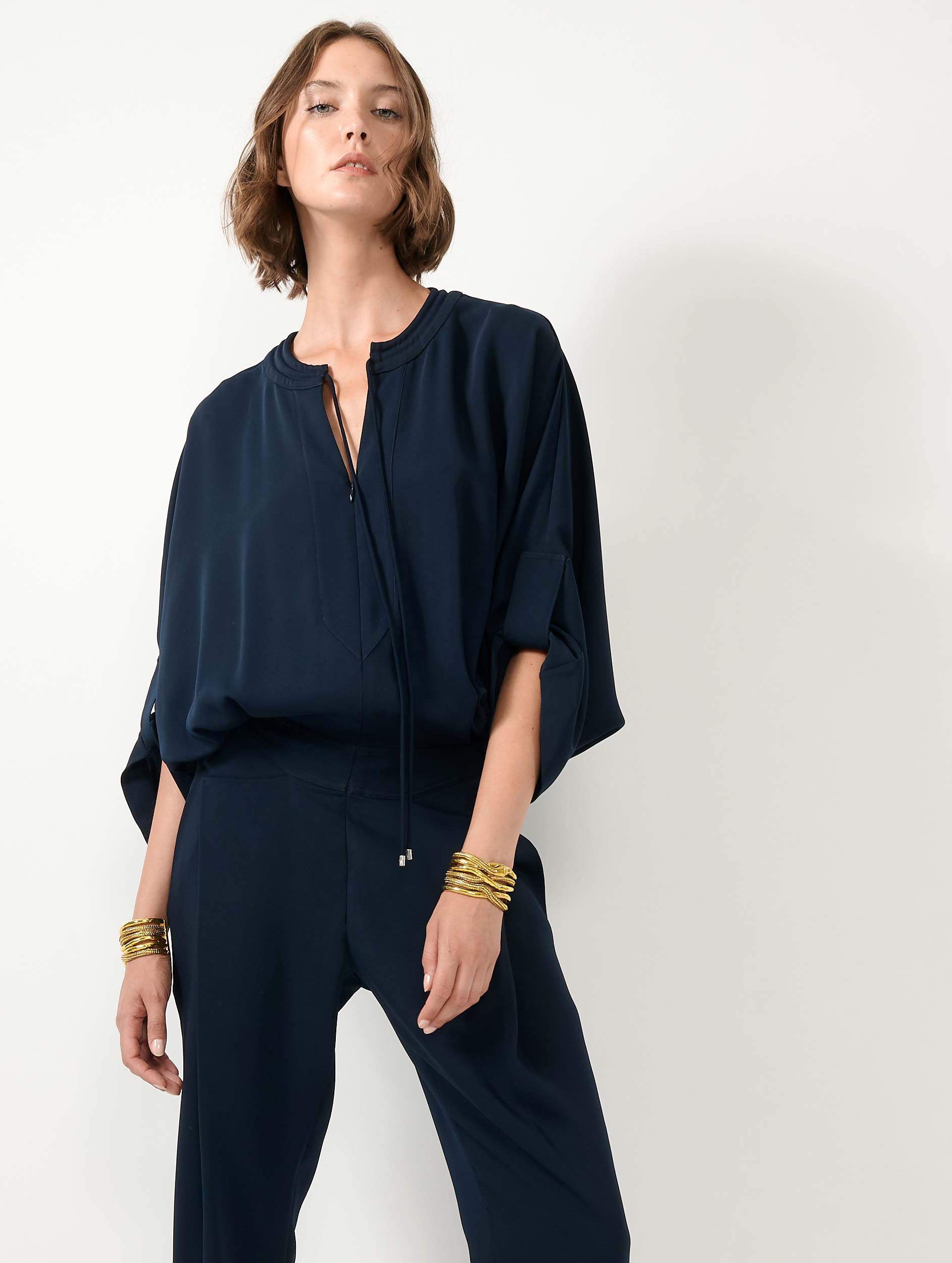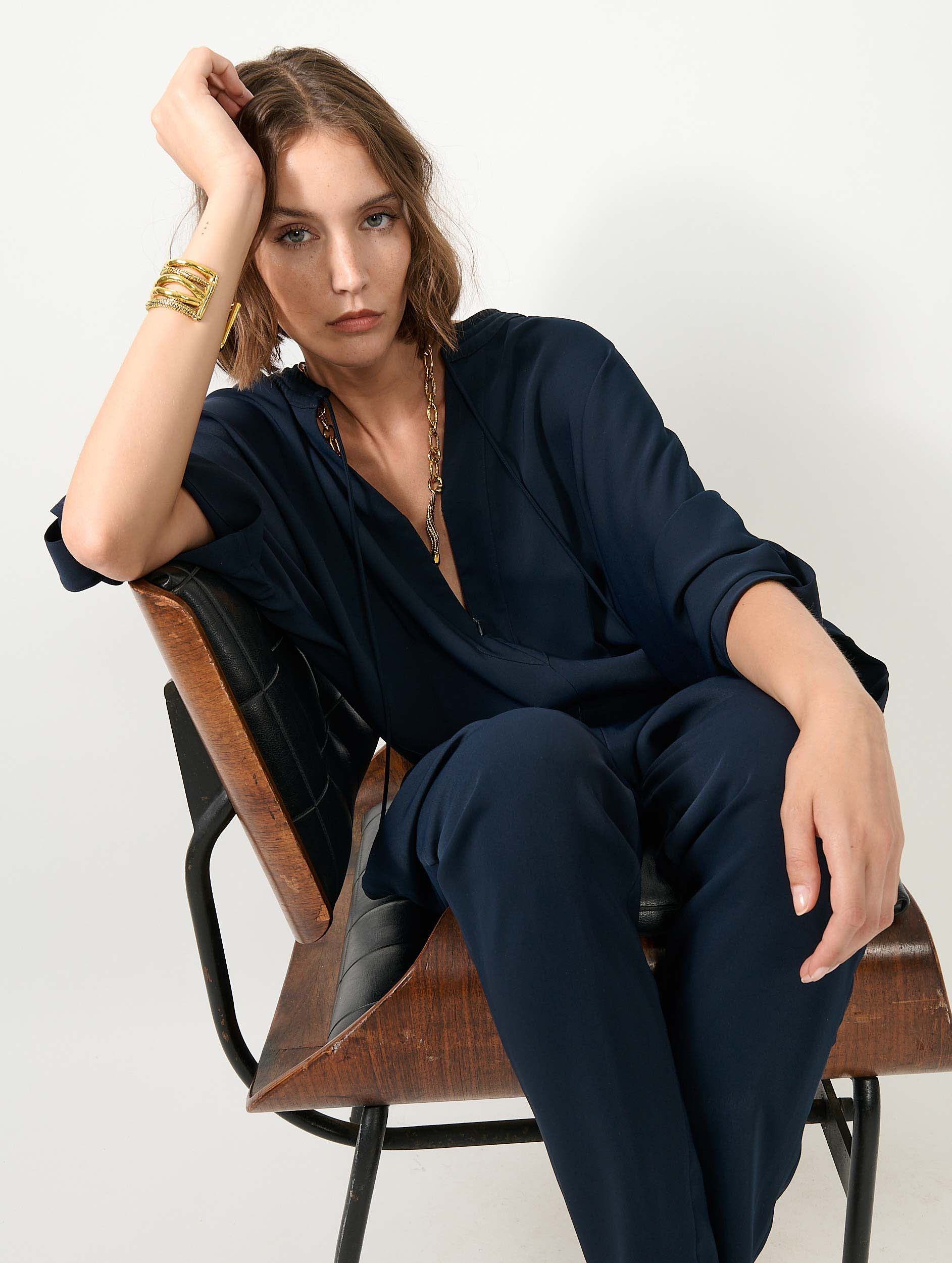 Inspired by our pleated trousers and matching zip-up jacket, this jumpsuit combines these two on-trend pieces into one. Made from fluid crêpe in ivory, navy blue or black, this smart jumpsuit has sleeves cleverly rolled up with tabs, a round collar with biker quilting that deepens into a zipped Tunisian neckline, and drawstrings. The cinched waist enhances the silhouette, while the fluid trousers offer comfort and movement without sacrificing elegance.