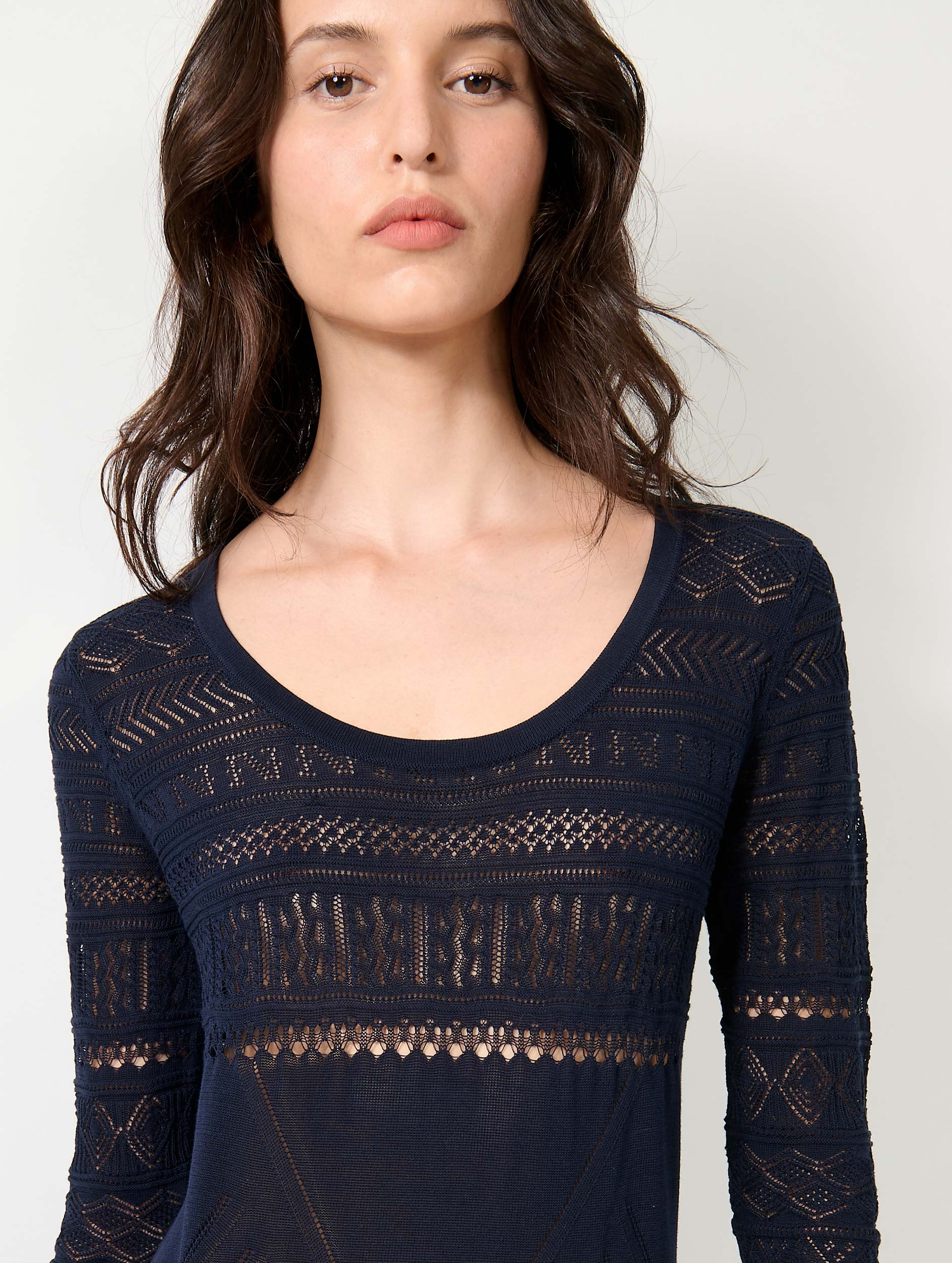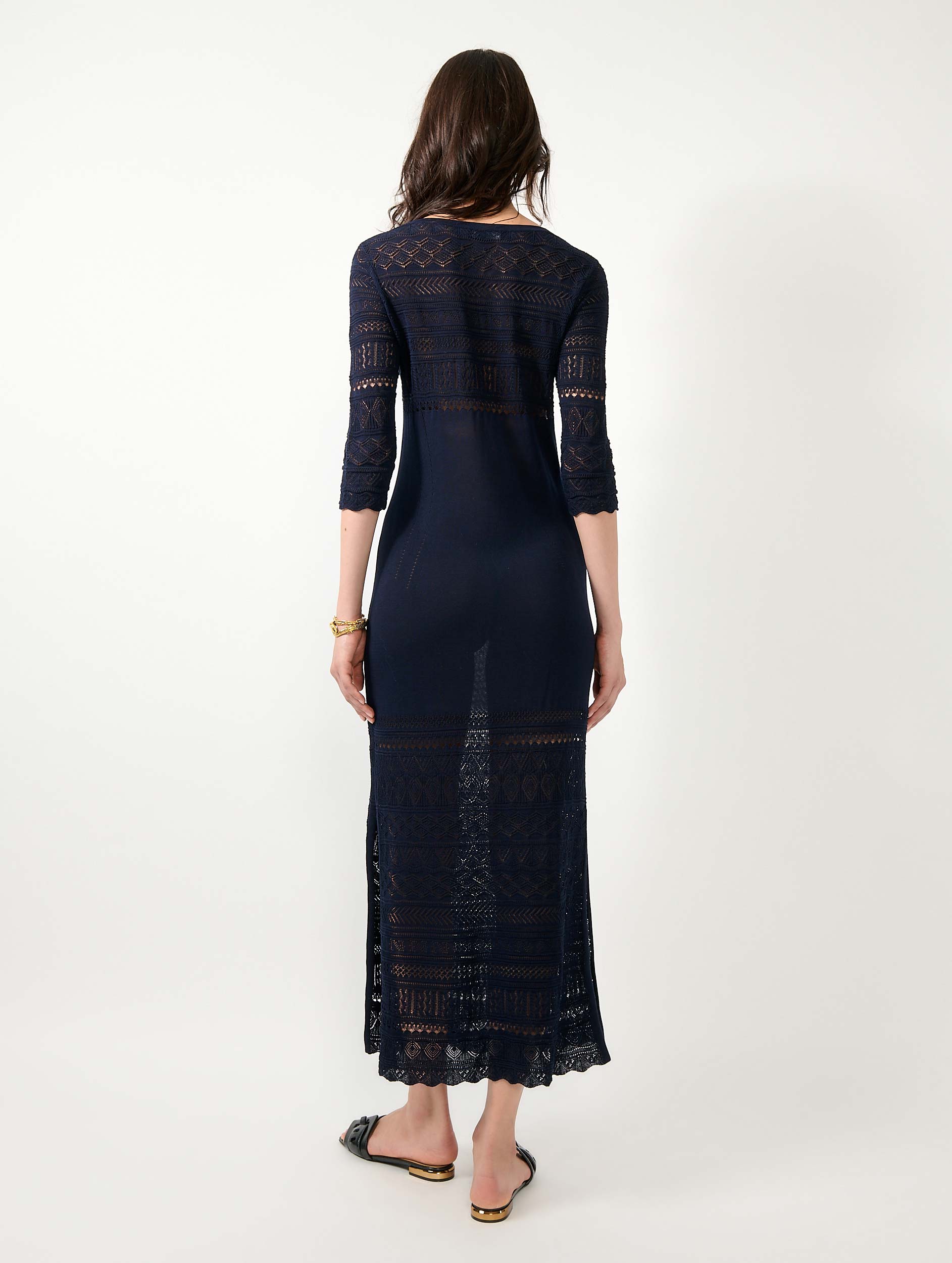 This long dress is crafted from lightweight pointelle knit, echoing the delicacy of lace. The placement of its motifs—created through openwork knit detailing—and its shaping decreases sculpt the silhouette for an elegant look. A side slit on each side nonchalantly reveals the leg. Its three-quarter sleeves are scalloped, a refined detail that enhances the femininity of this timeless piece.