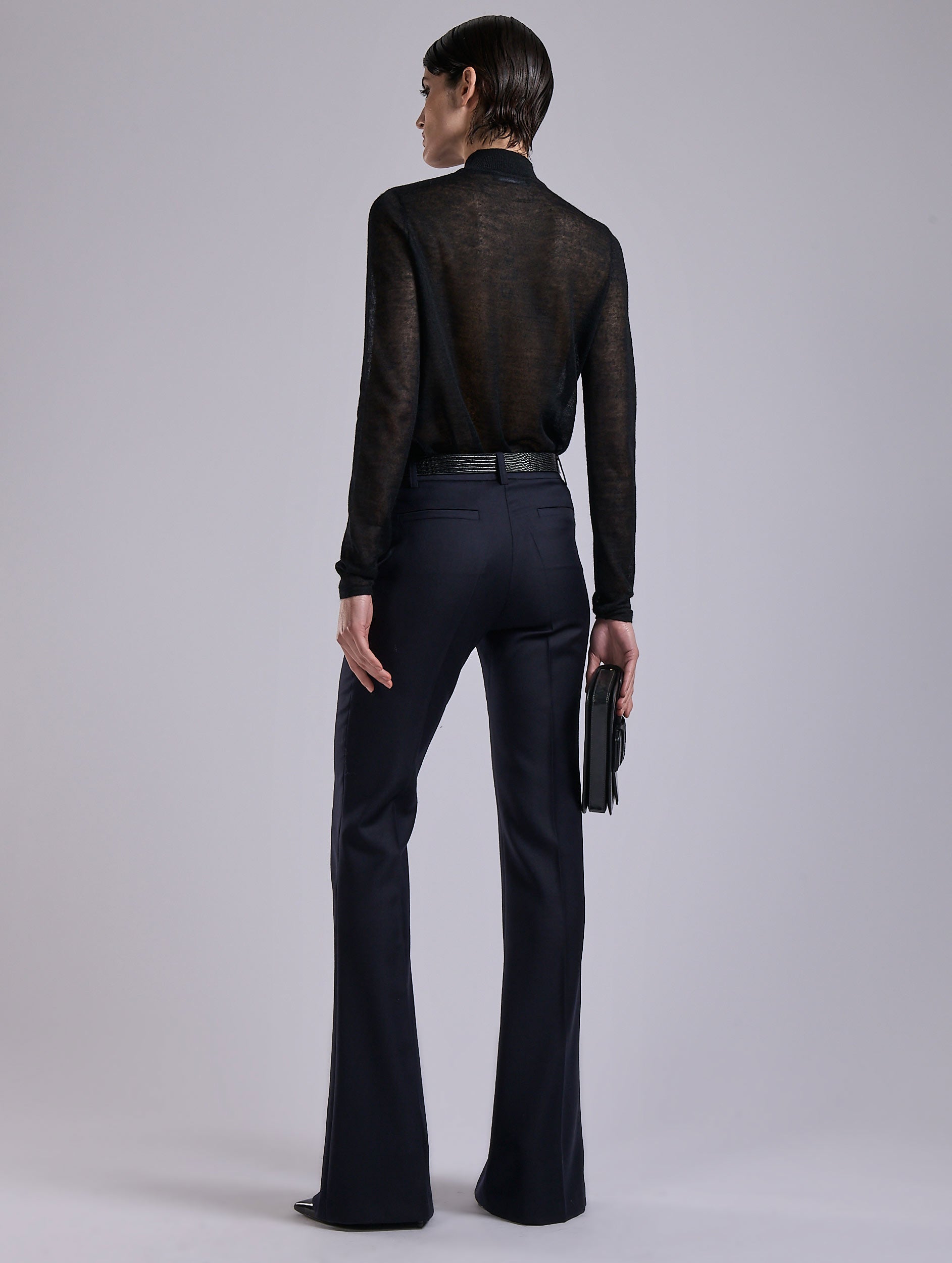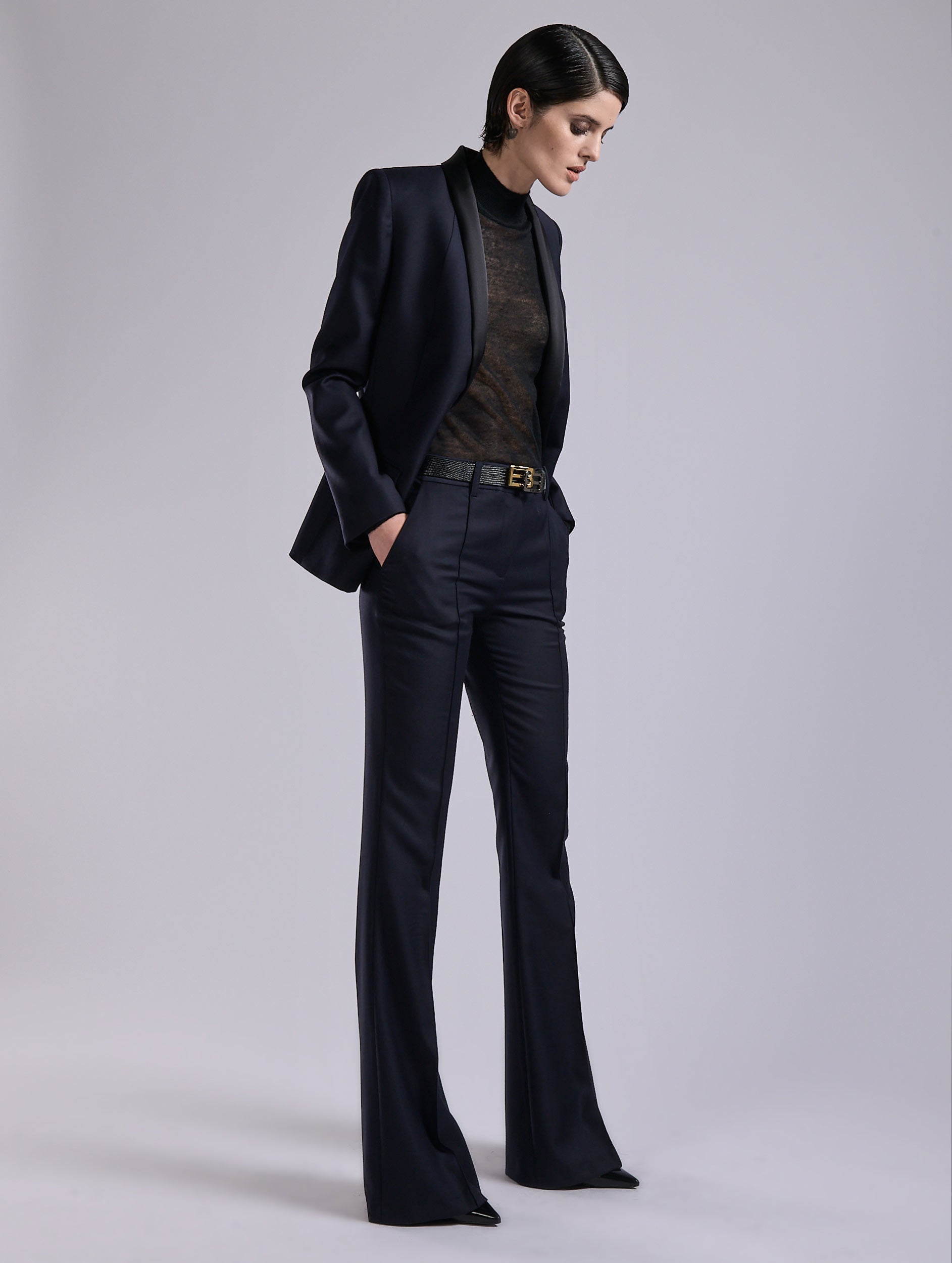 These bootleg trousers show a sculptural cut in a wool and cashmere twill blend that is soft and elegant to the touch. Offered in navy or grey, this women’s suit pant defines a sharp and contemporary silhouette. It pairs with the matching jacket with zippered sleeves for a total sartorial look inspired by the men’s wardrobe. A stitched pleat running down the leg, flared cut, and flawless finishes: every detail contributes to the sophisticated simplicity of this tailored pant.