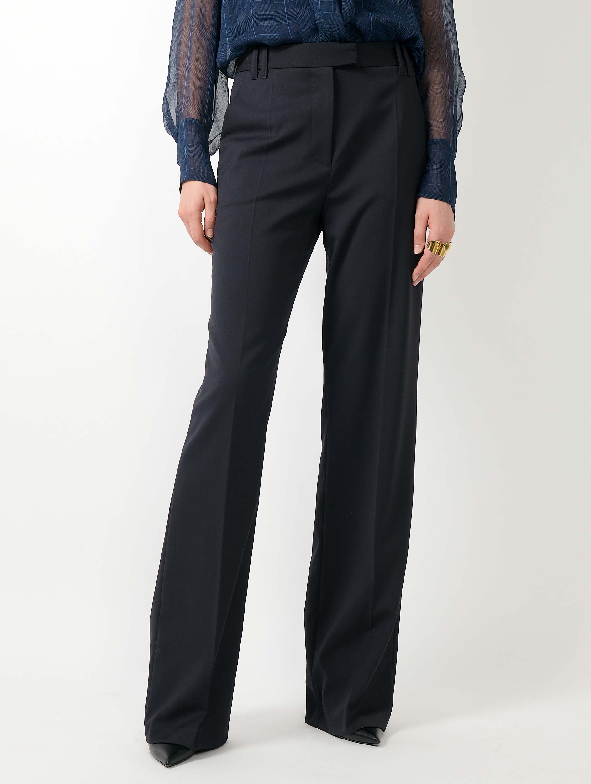 A cornerstone of the Barbara Bui wardrobe, these tailored trousers blend masculine tailoring with flawless craftsmanship designed for a feminine silhouette. Made from stretch wool gabardine, they feature a high-rise waist, wide-leg cut, and sharp crease for a sleek, elongating effect. The concealed button closure, welt pockets, and reinforced front belt loops highlight the clean, refined finish. Available in black or navy, they pair perfectly with the matching blazer with a pronounced collar and zippered sleeves. Ideal for business meetings or special occasions, these trousers offer effortless elegance and comfort.