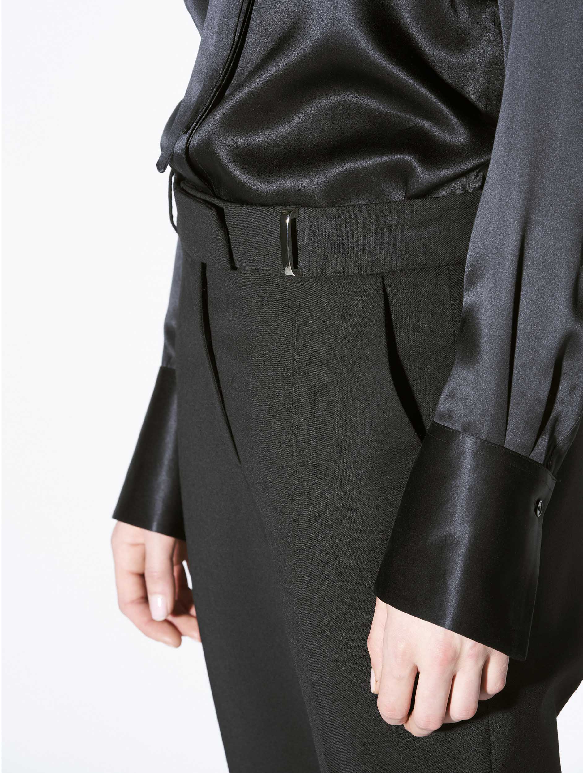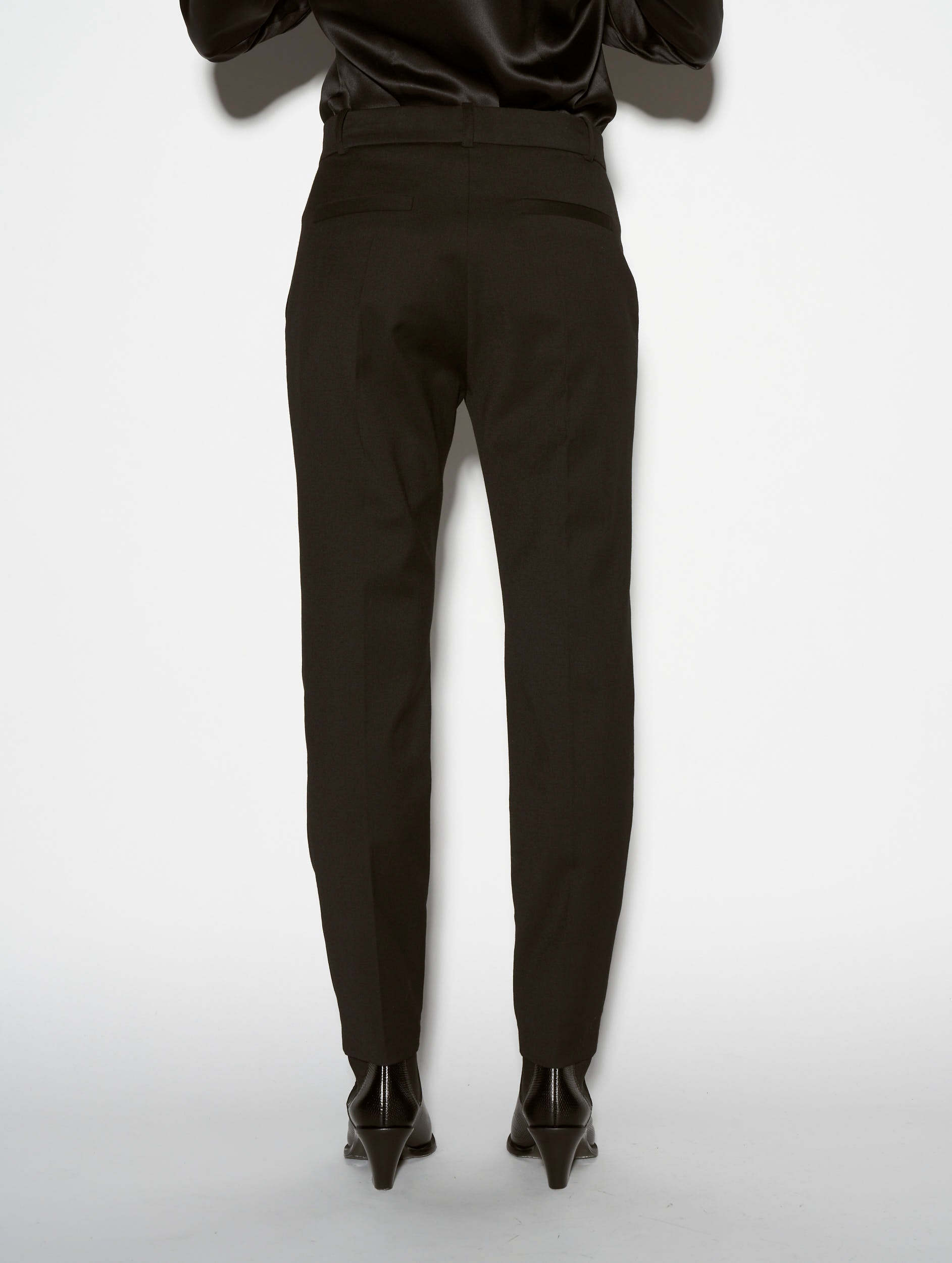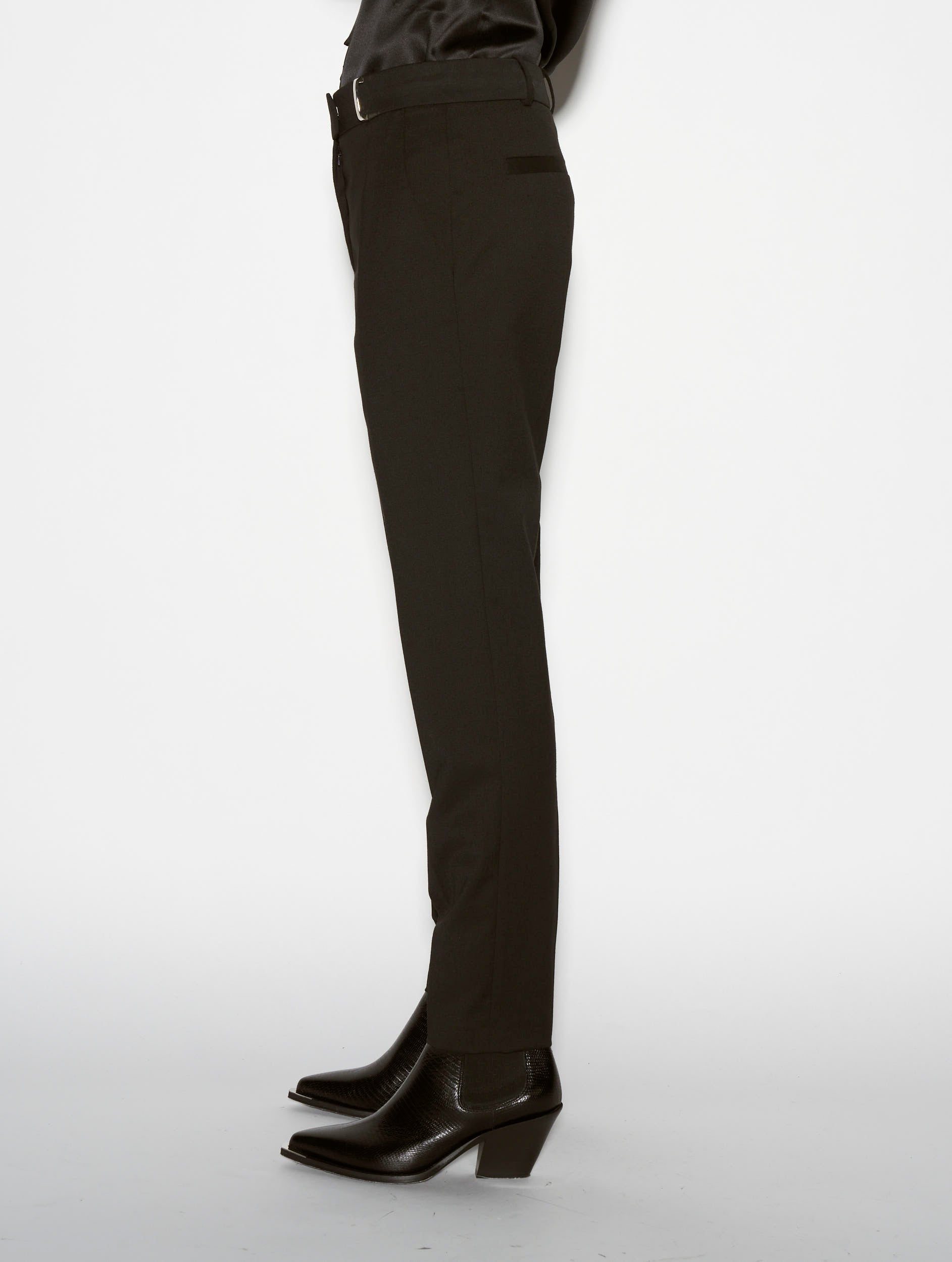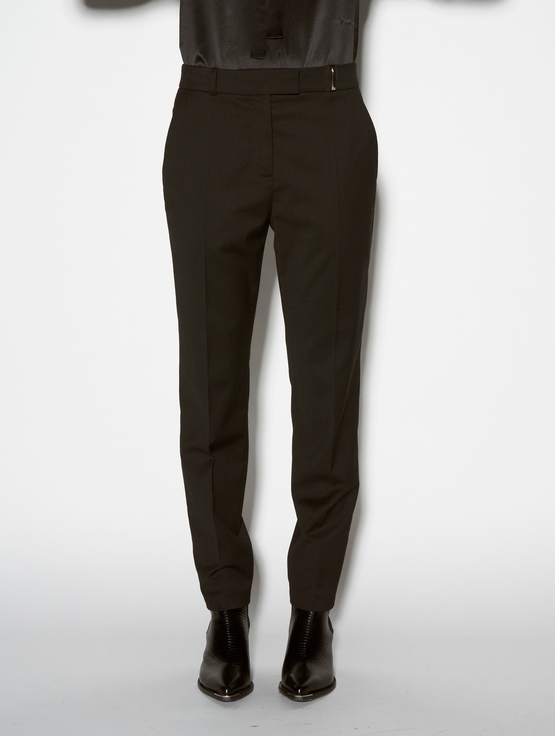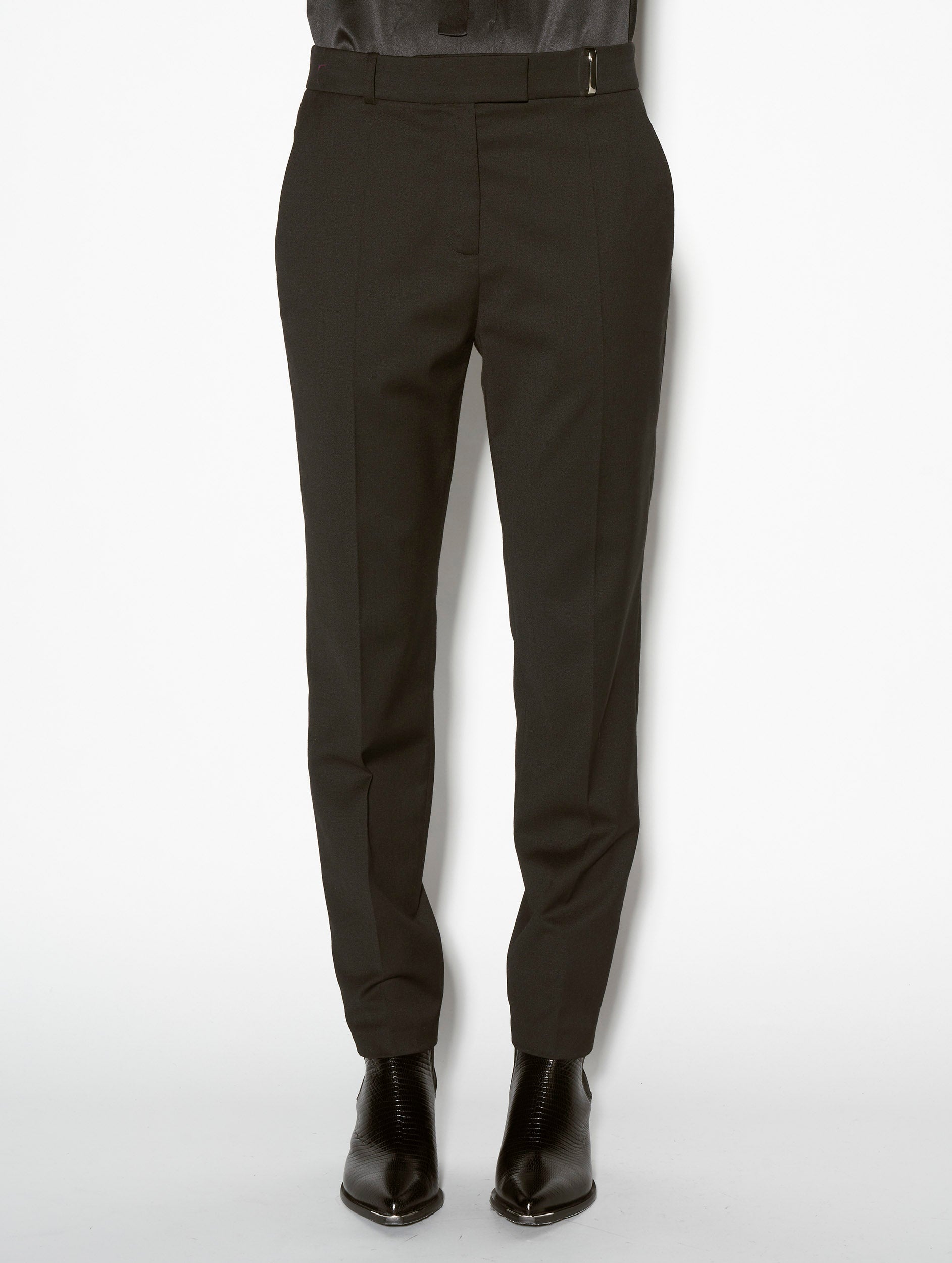 Our ever popular Roxy cut lends structured drape and everyday freedom of movement to women's classic suit trousers. Crafted in stretch wool gabardine for the Autumn/Winter season, these black tailored trousers have a sleek and elegant look thanks to their impeccable finish. Expert in the art of tailoring, our Parisian fashion house's sense of detail can be seen in the concealed button placket, rear welt pockets and slant pockets. These women's suit trousers feature belt loops at the waist, including a silver metal jewelled loop for a touch of fantasy. Ideal for all occasions, these women's suit trousers are available in black, grey or olive green.
