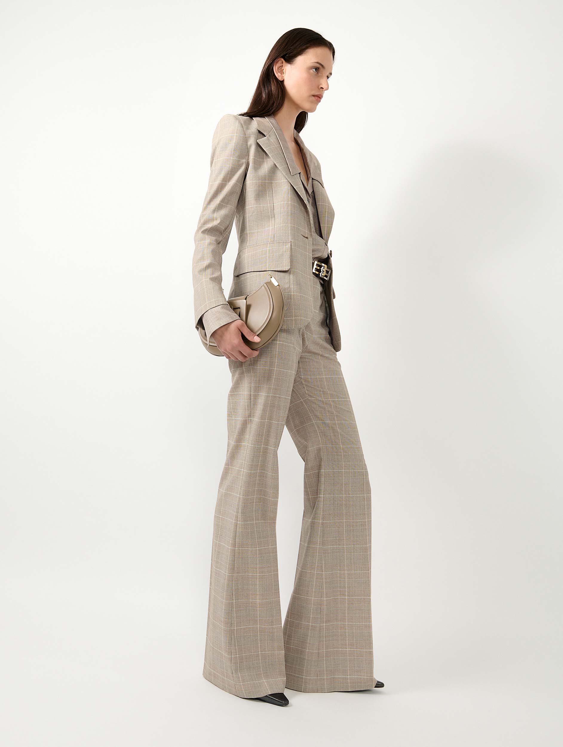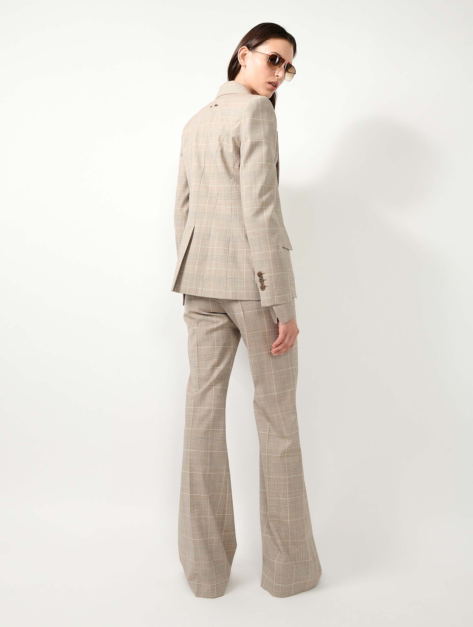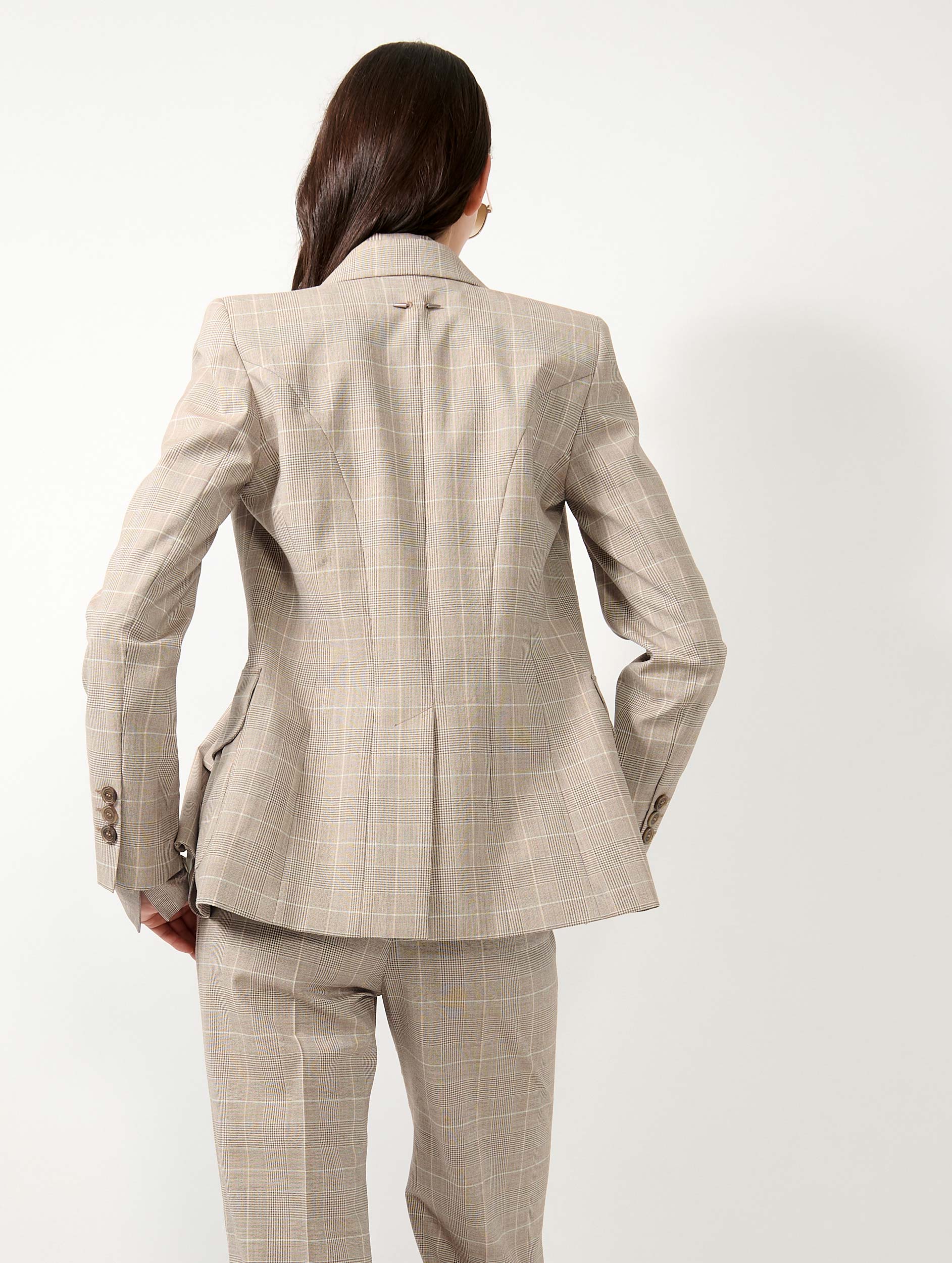 Barbara Bui reinterprets the Prince of Wales check, an icon of menswear tailoring, to design a women’s suit jacket with a beautifully tailored drape. Discreet zip openings along the sleeves invite the jacket to be worn open for a more relaxed attitude. This fitted blazer is woven from Italian wool that promises comfort and softness for this timeless piece. Its sand hue, enlivened by subtle graphic checks, lends itself to a head-to-toe look in a reimagined three-piece suit. Darts, a back vent, collar structure, asymmetrically cut pockets, and a silver-tone metal piercing: every detail enhances the elegance of this jacket.