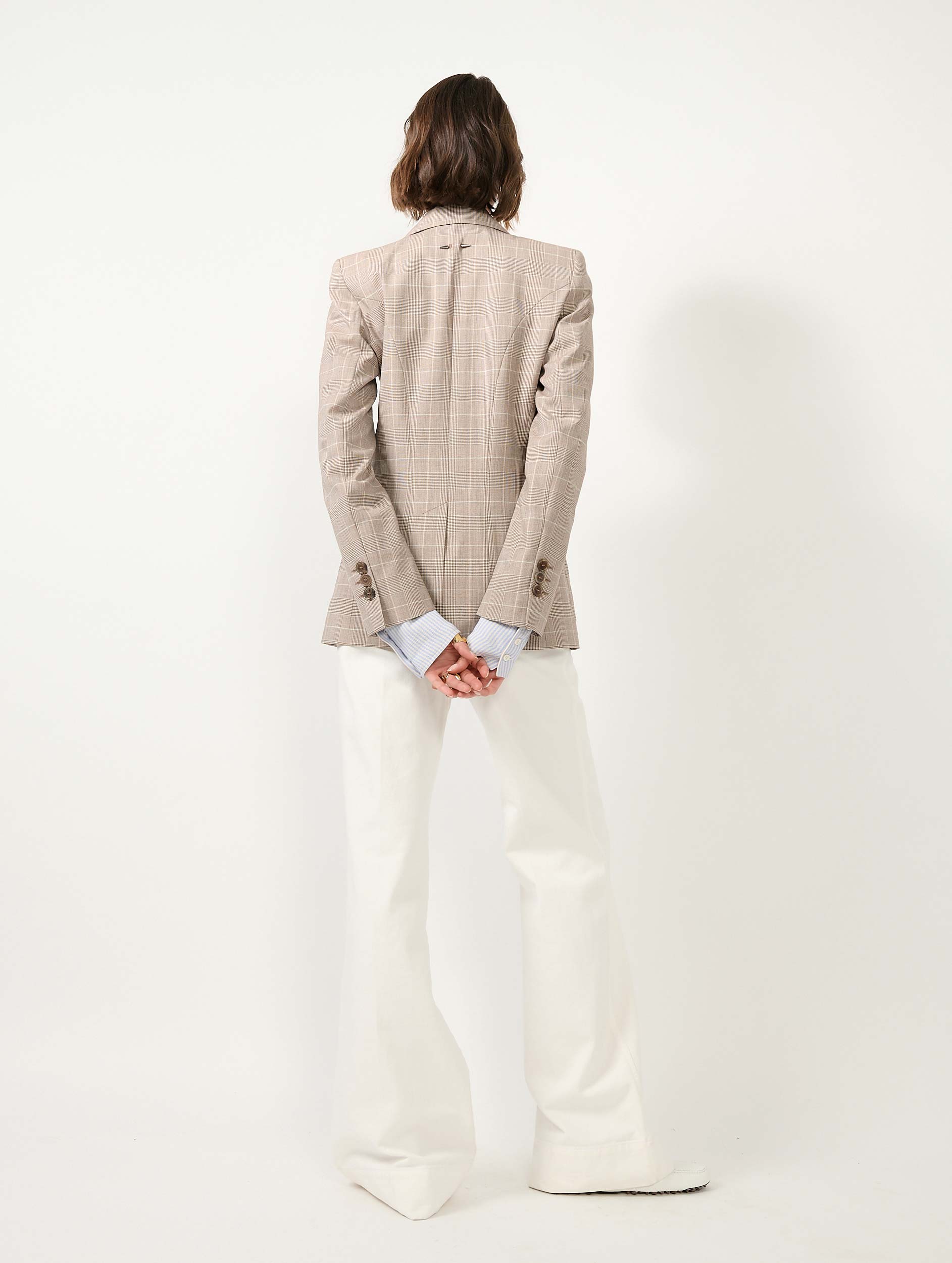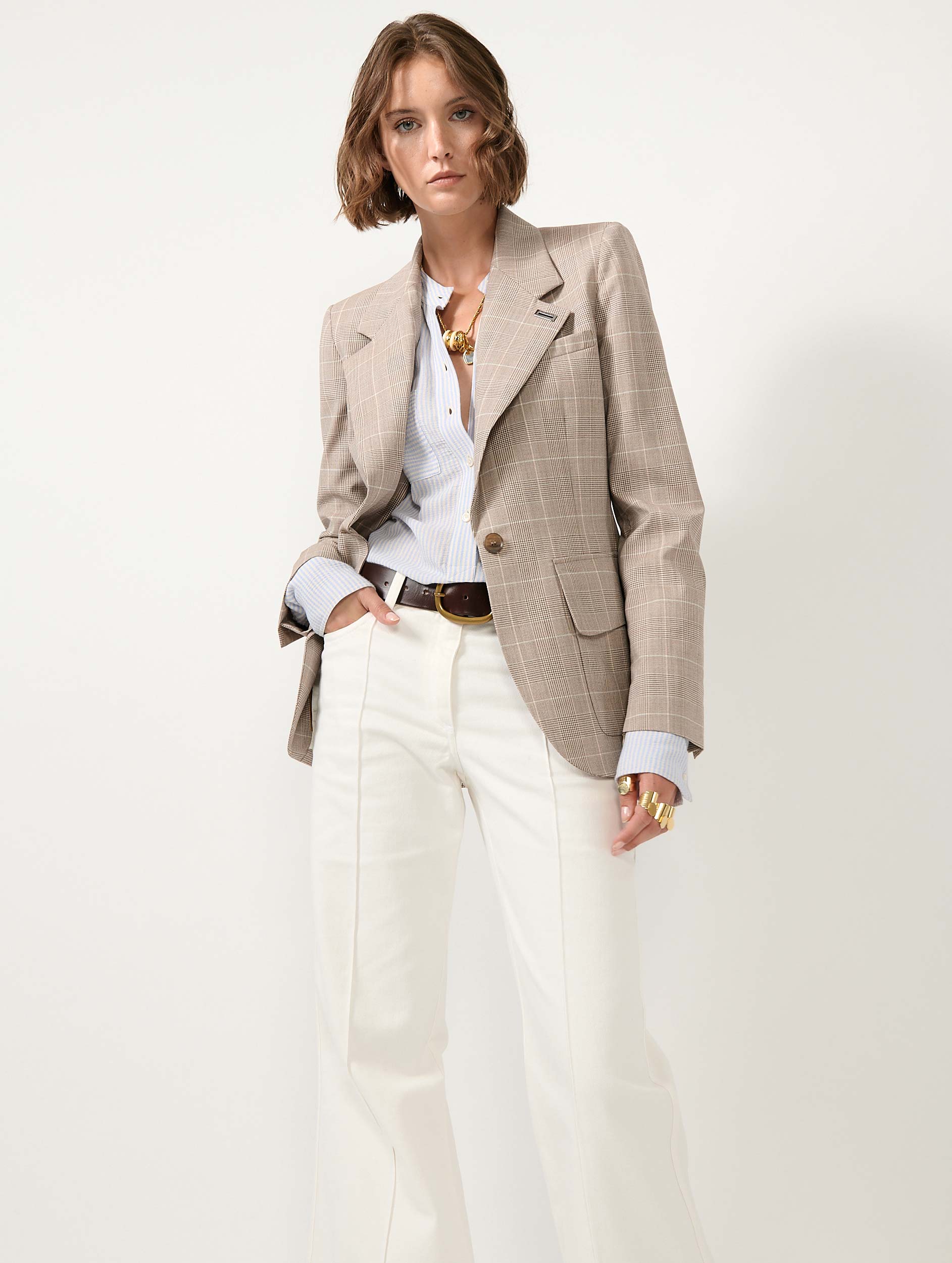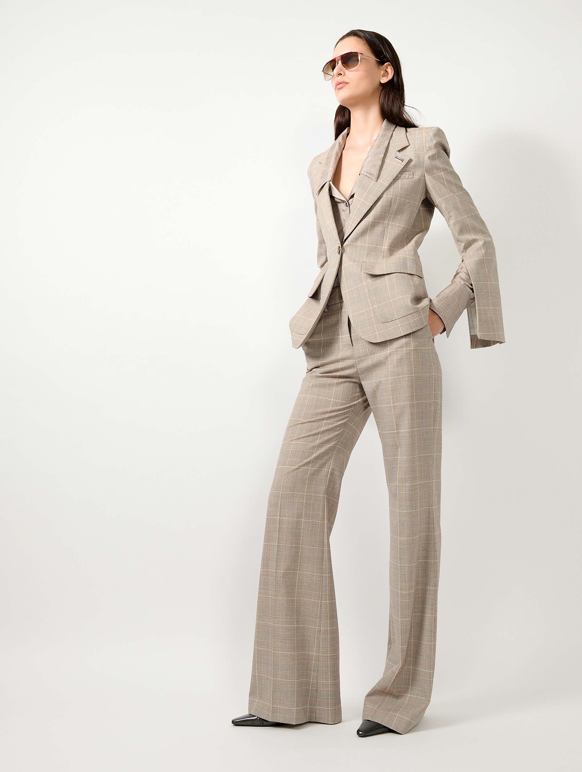 Barbara Bui reinterprets the Prince of Wales check, an icon of menswear tailoring, to design a women’s suit jacket with a beautifully tailored drape. Discreet zip openings along the sleeves invite the jacket to be worn open for a more relaxed attitude. This fitted blazer is woven from Italian wool that promises comfort and softness for this timeless piece. Its sand hue, enlivened by subtle graphic checks, lends itself to a head-to-toe look in a reimagined three-piece suit. Darts, a back vent, collar structure, asymmetrically cut pockets, and a silver-tone metal piercing: every detail enhances the elegance of this jacket.