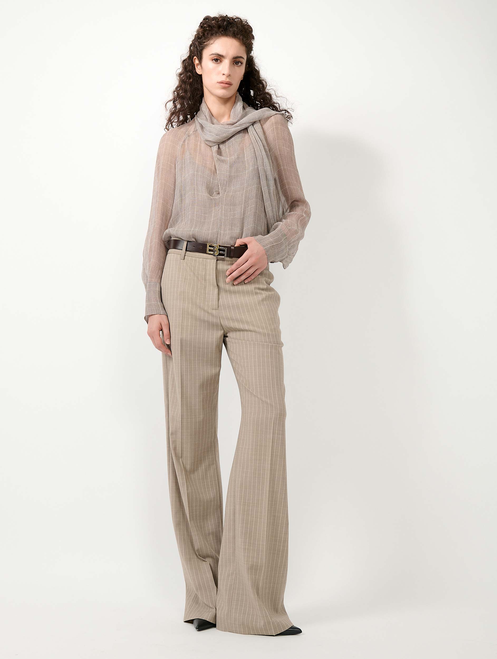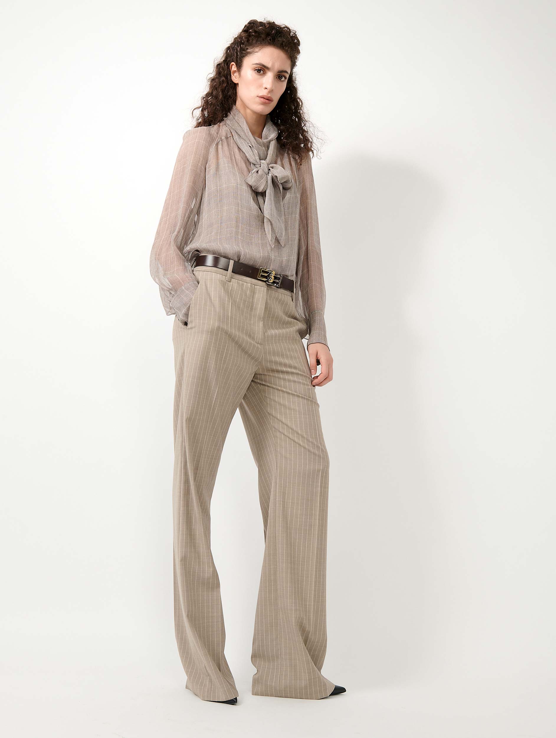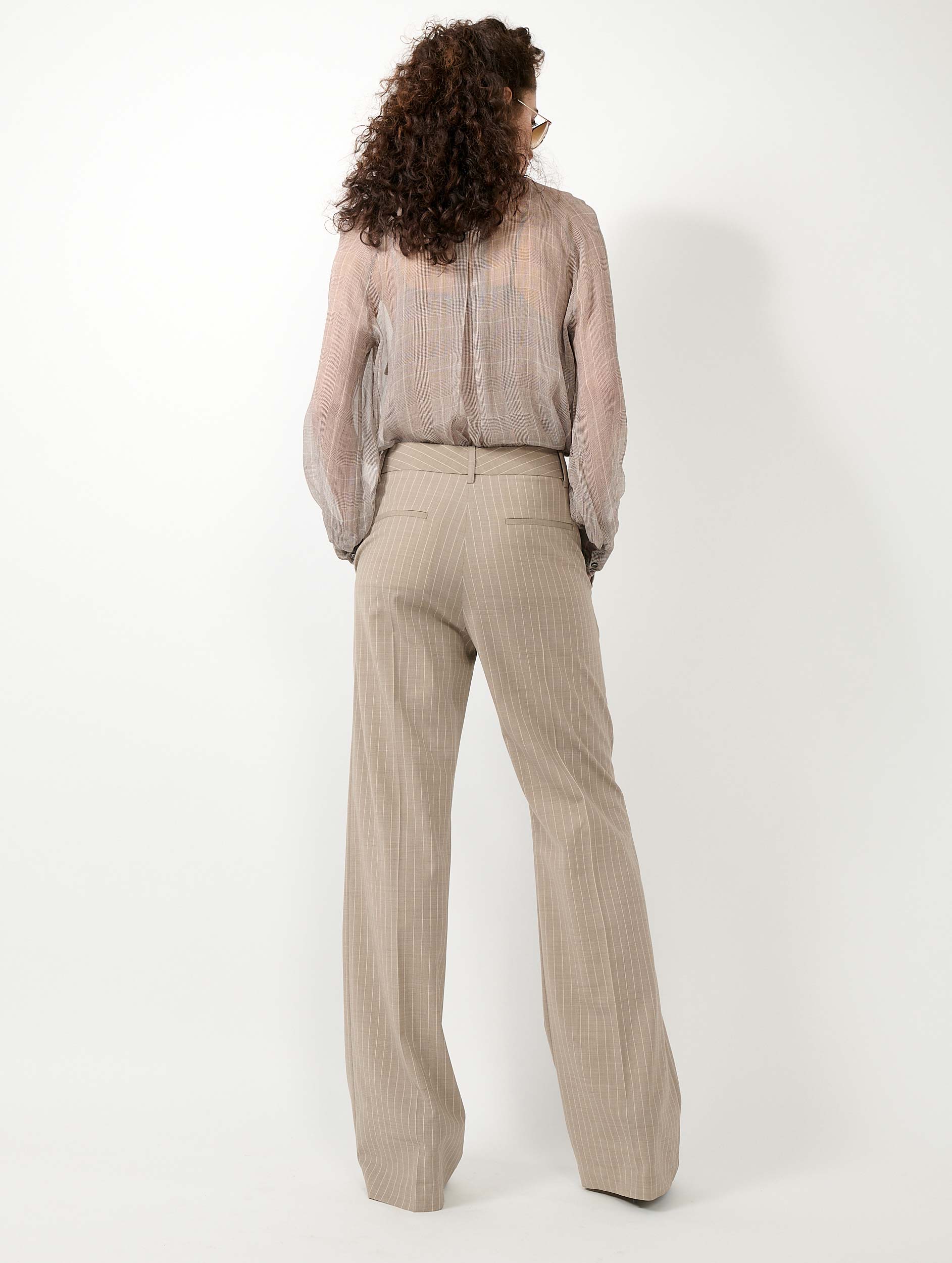Tailoring is Barbara Bui's favourite field of expression. Alliance of sharp lines and elegant details, these mounted waist suit trousers with graphic tennis stripes propose a modern allure inspired by masculine business looks. Their high-waisted cut with wide legs and marked crease elongate the silhouette. Associated with the matching striped suit jacket and waistcoat or worn with a fluid shirt with Prince of Wales motifs, these trousers are a favourite of the sartorial wardrobe for an elegantly revisited boyish attitude.