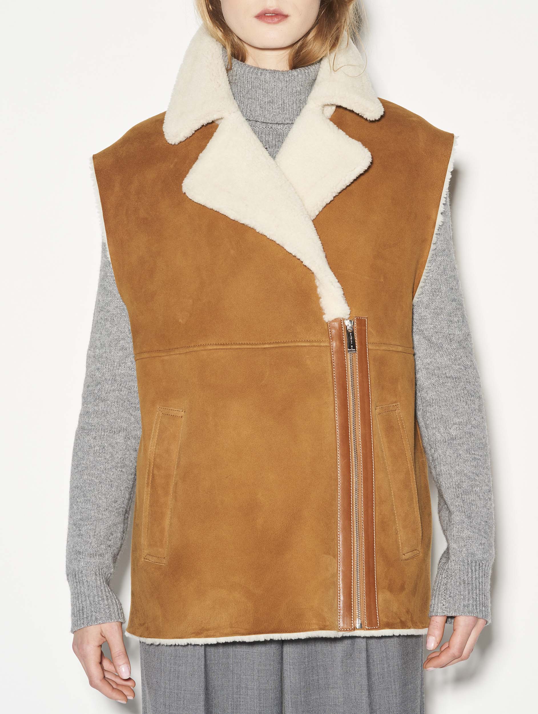 This sleeveless jacket in camel and ecru shearling will become your wardrobe staple as soon as the autumn comes. Ideal for early season wear, this sleek straight-zipped jacket features two practical slant pockets for everyday use. The toning shearling interior ensures comfort and warmth. A real cocoon, this casual smart jacket can be worn over a knitted sweater or on top of a leather jacket for a put-together total look. In town or on the ski slopes, this women's shearling jacket will become a wardrobe staple that you will rediscover each season with pleasure. This model is also available in black monochrome shearling.