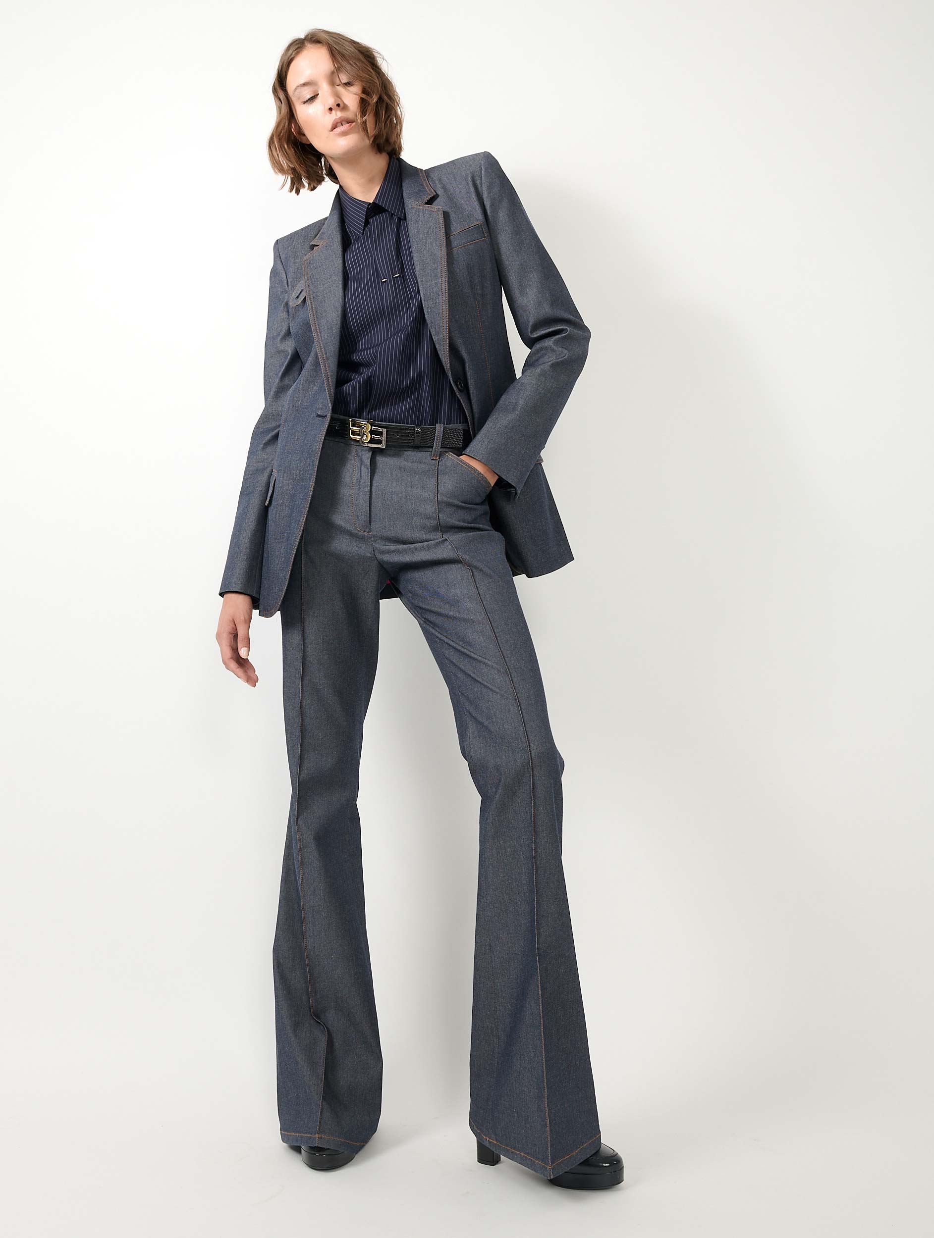 Crafted in washed denim with tobacco stitching, this jacket will be your mid-season ally. Its feminine slim fit is underlined by our Bootleg cut denim pants for a masterful play on volume and a long, slim silhouette. Featuring a removable tab at the collar, this jacket is also distinguished by its feminine collar stand lined in Prince of Wales fabric, a reminder of Roxy's suit pants in the same pattern for an outfit with boyish accents. The back features our signature piercing for a resolutely rock look.