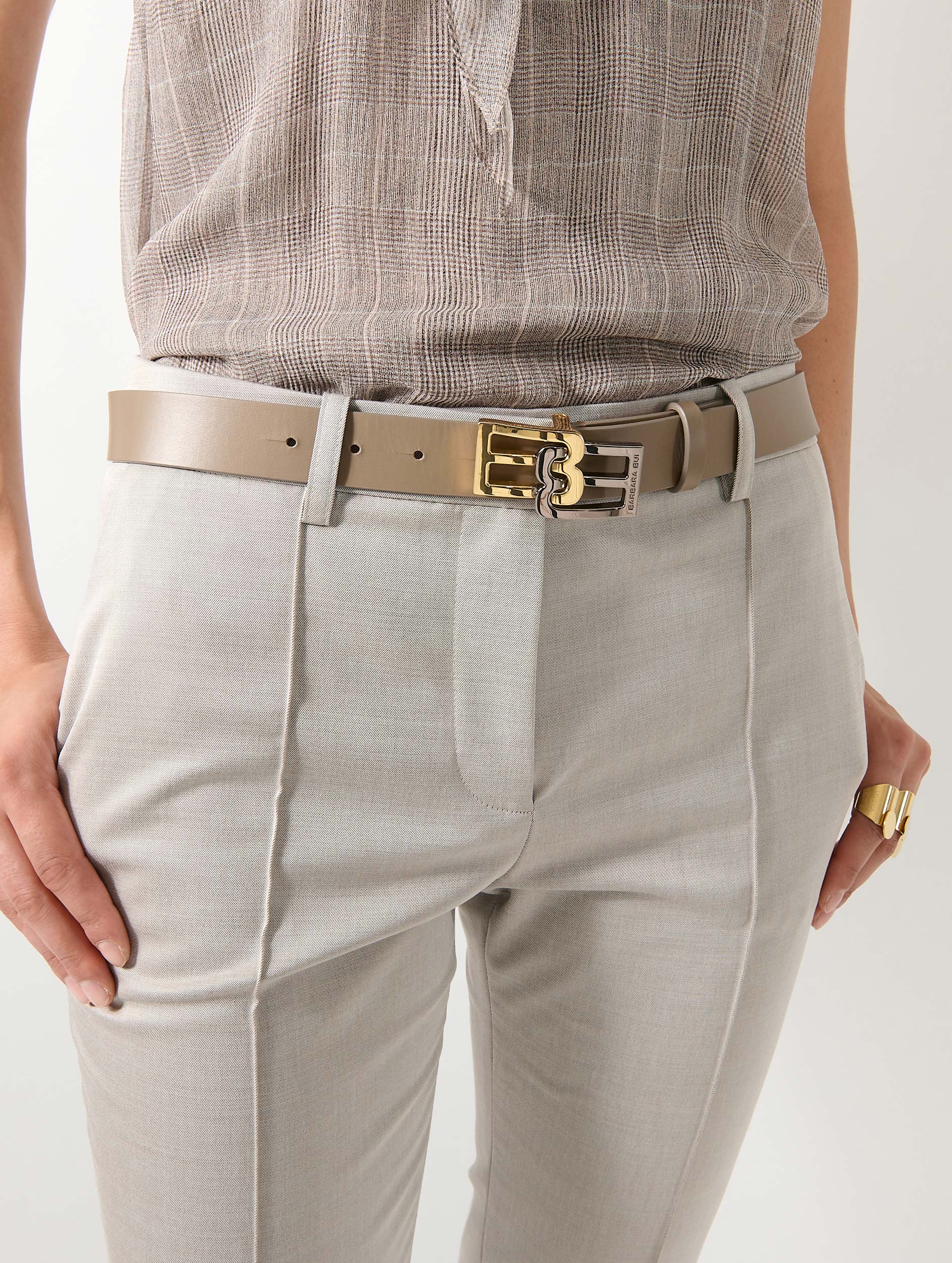 Taupe satin leather belt. New Barbara Bui logo buckle, two-tone gold and silver finish. 5-hole adjustment.