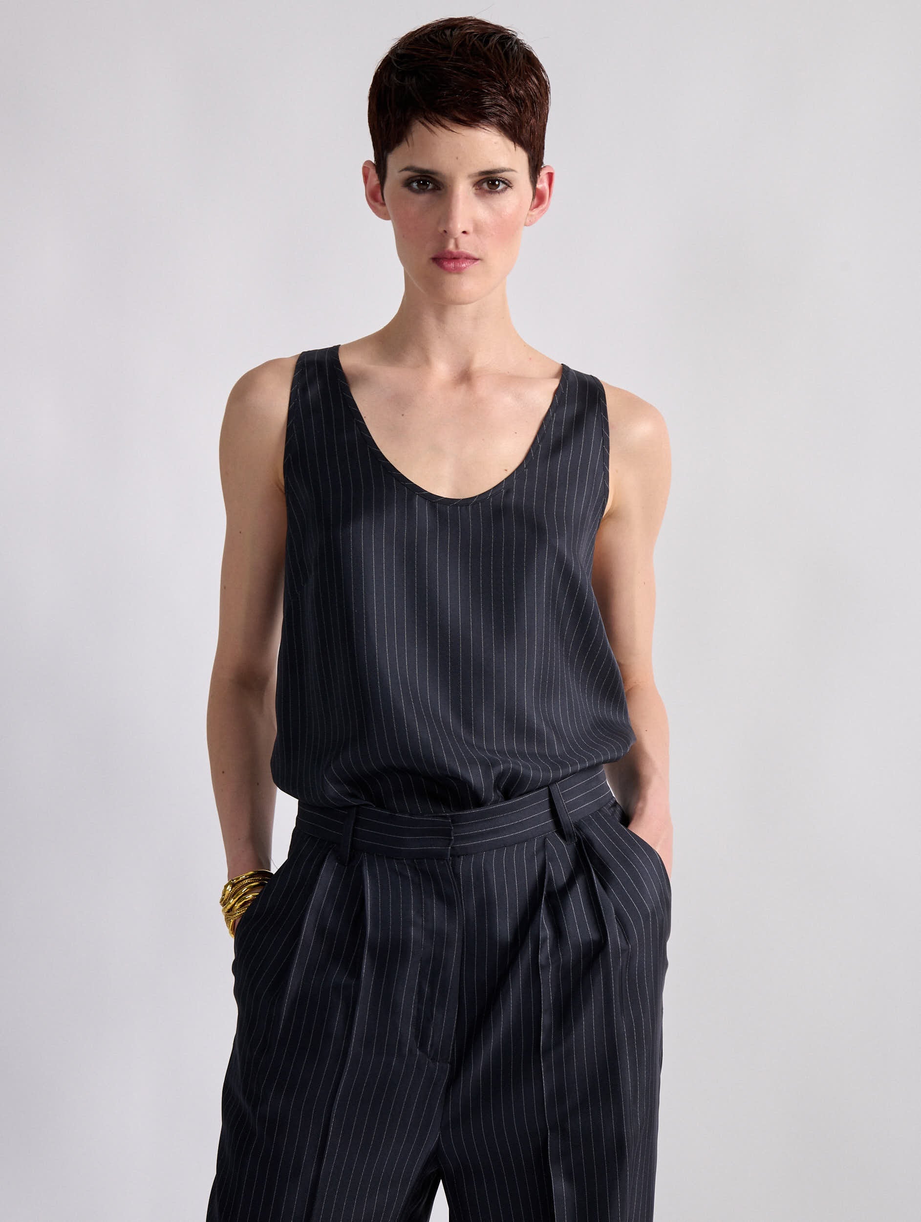 This silk tank top features fine stripes inspired by Italian suits, icons of men's tailoring. It can be worn separately or paired with a jacket and pants in the same fabric, or slipped under a matching wrap dress to secure the neckline.