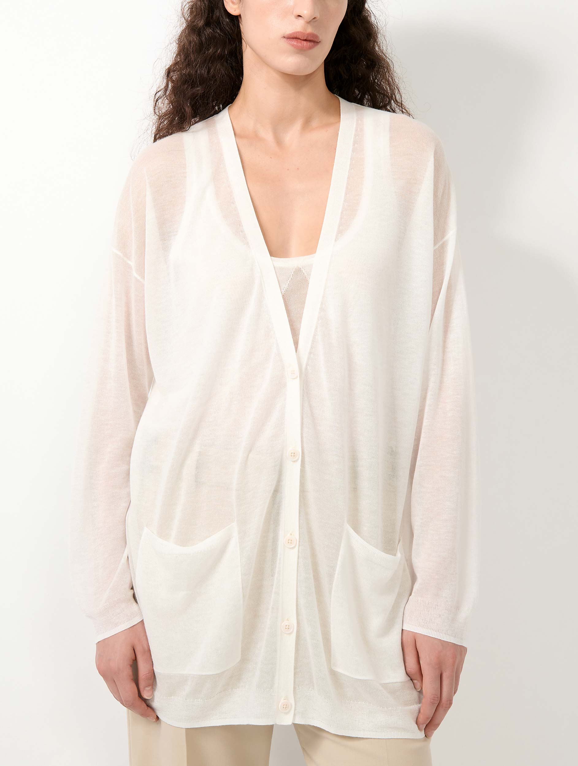 Light and soft to wear, this women's cardigan adopts a long loose cut for a cleverly relaxed chic allure. Thought to be worn as a twin-set over the matching tank top, this extra-fine knit cardigan elegantly plays on transparency. Sensitive to the freedom of movement and the attitude promoted by her wardrobe, Barbara Bui has endowed this timeless piece with two generous patch pockets. At the back, this long cardigan, available in white or black, is accessorized with our signature detachable silver-tone metal piercing.