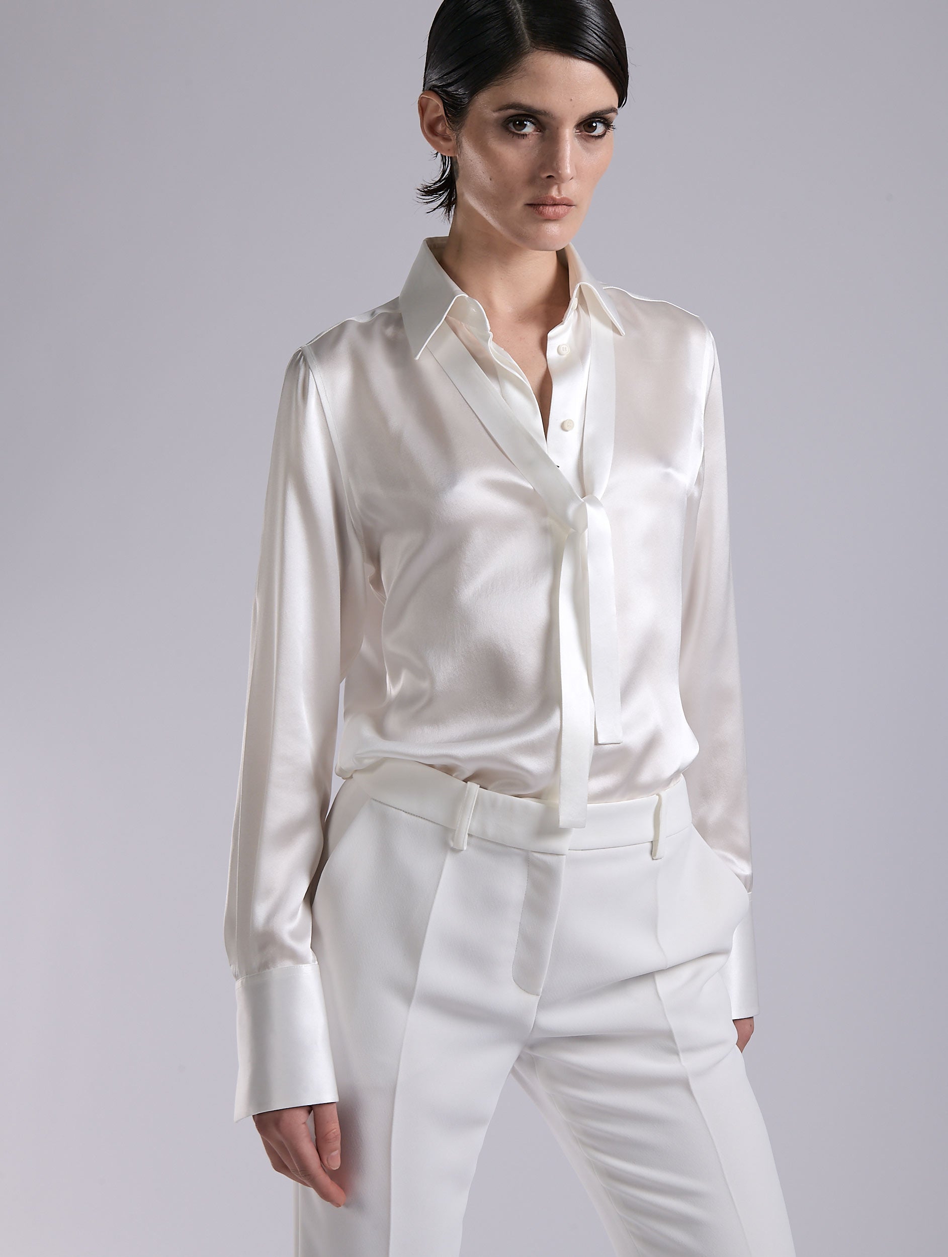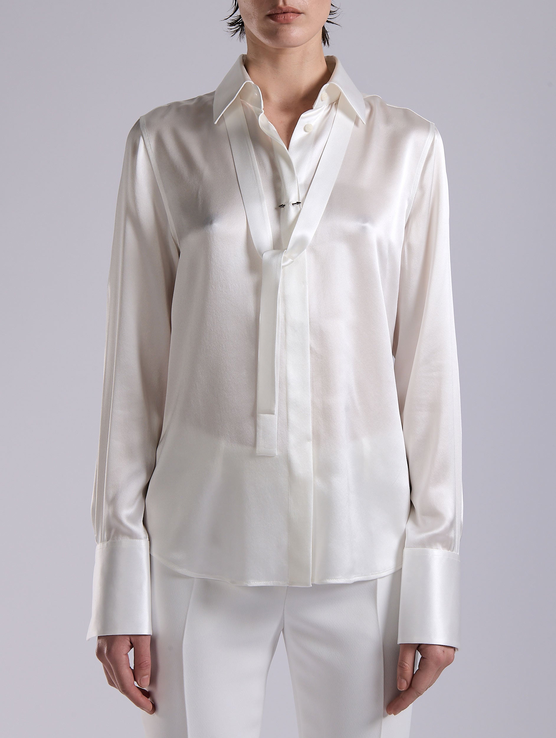 White silk satin lavallière shirt