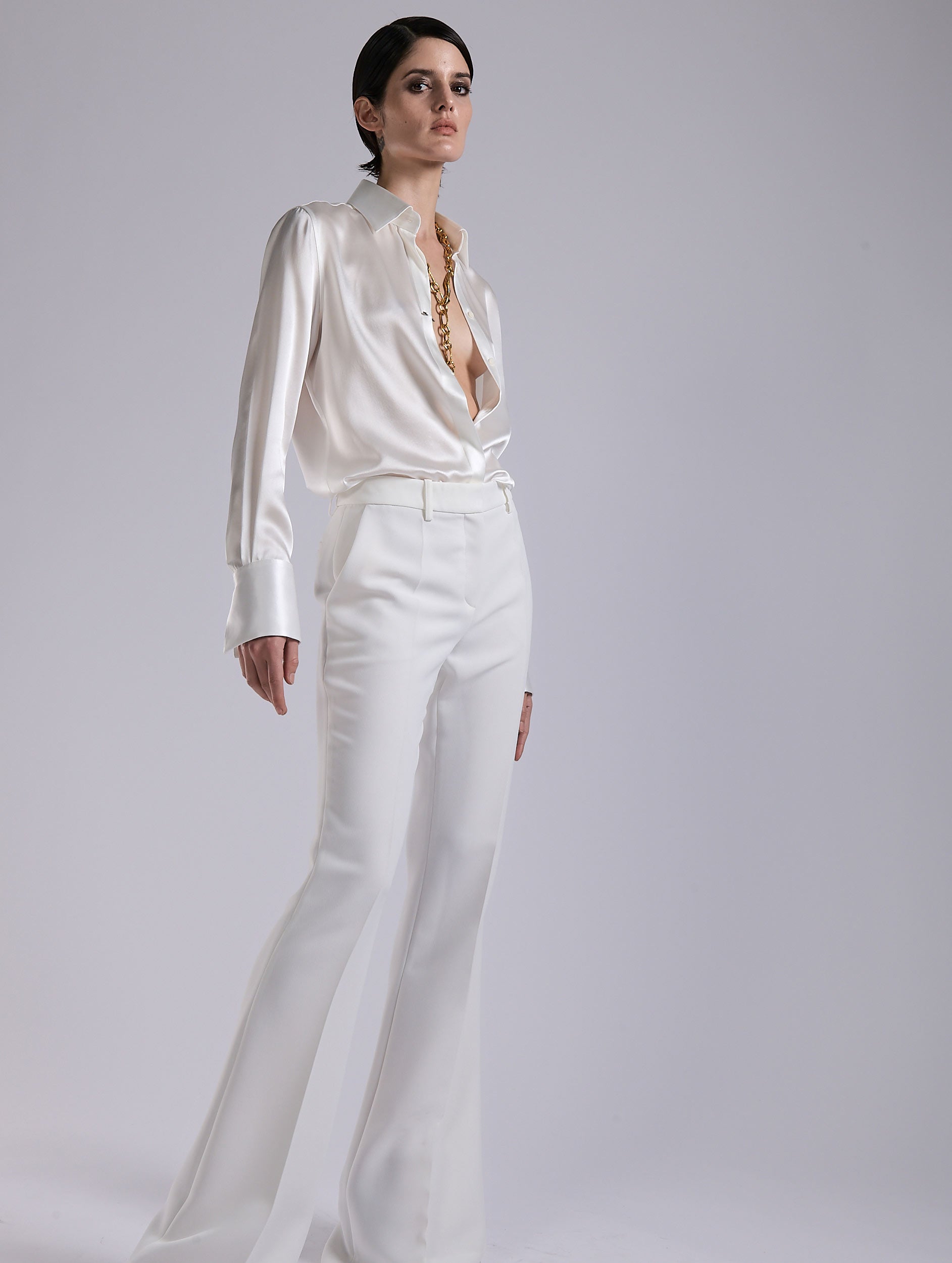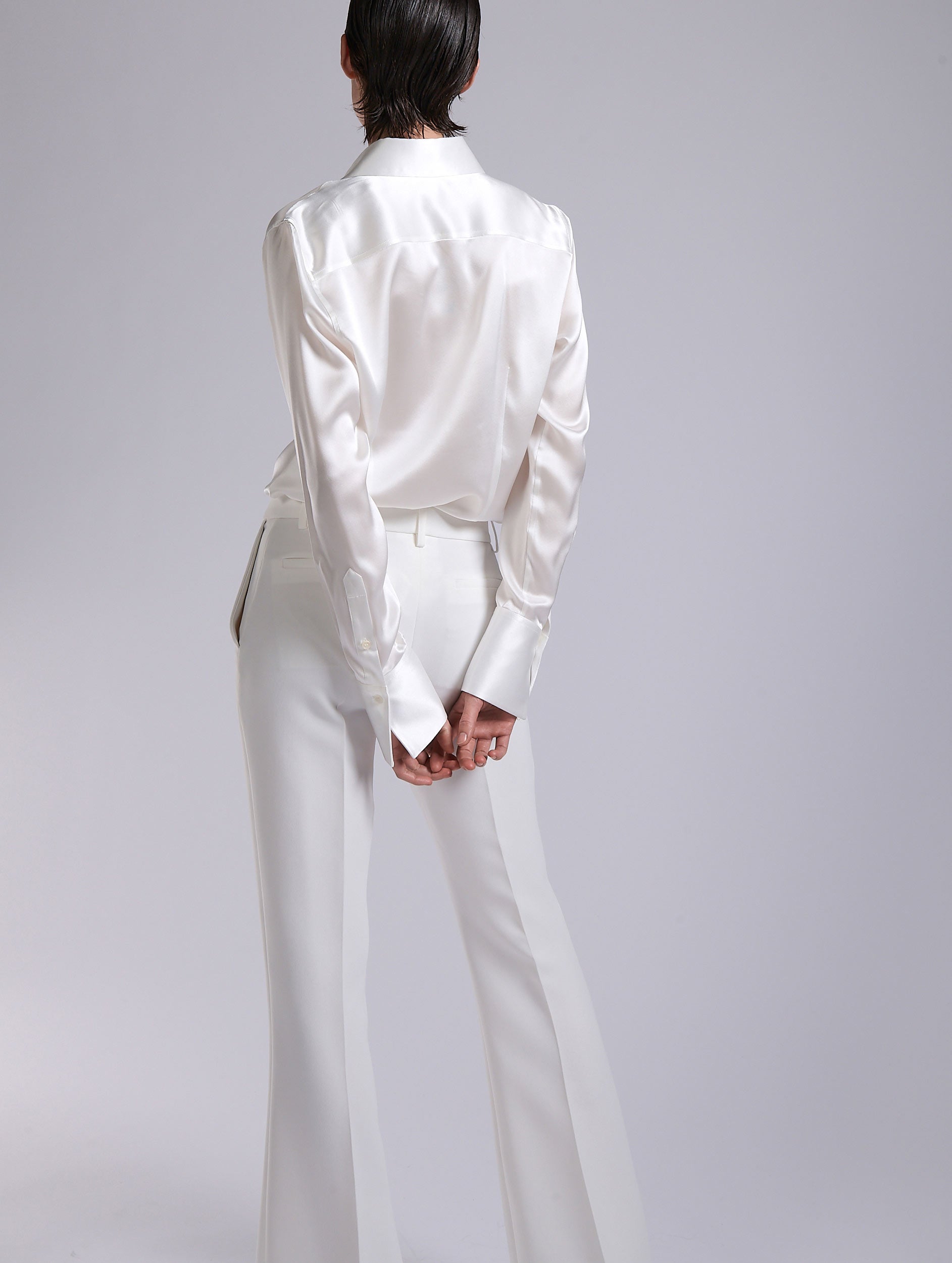Expected in every collection in its new color palette, our silk satin shirt has become a signature piece in the Barbara Bui wardrobe. Made in a flattering straight cut, this pure silk shirt features elongated cuffs designed to be revealed by the sleeve of a suit jacket. On its hidden placket, it is accessorized with the house’s signature piercing jewelry, while the fine removable tie, secured with a button at the back of the collar, can be replaced with a silk tie available in all the shirt's color options. A versatile and comfortable piece with a decidedly contemporary chic.