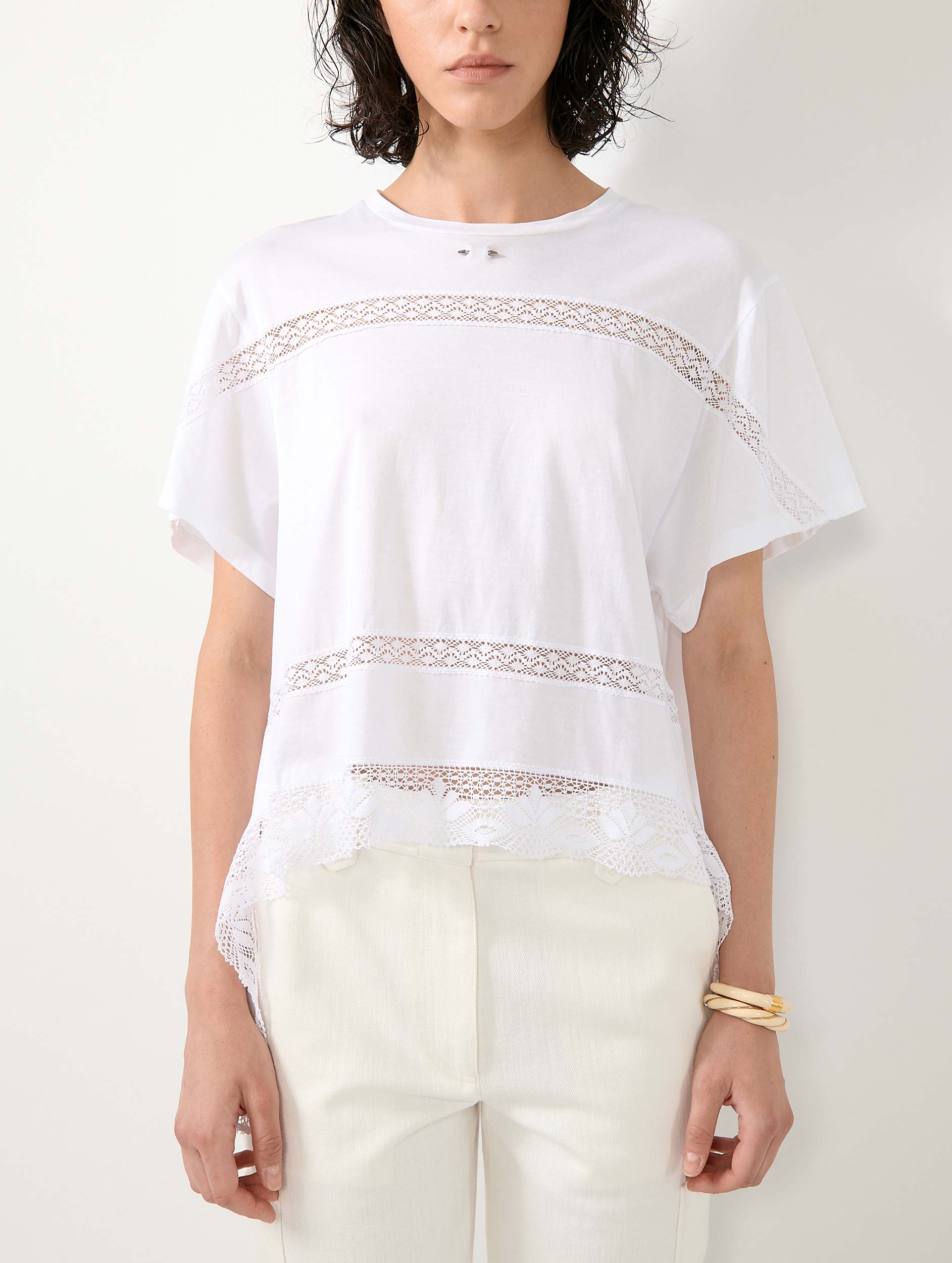 Combining refinement and ease, this cotton jersey T-shirt is enhanced with tone-on-tone lace inserts, crafted in two different patterns. Available in black or white, this short-sleeved T-shirt features an asymmetrical cut, shorter at the front, playing with proportions to energize the silhouette. Finished with the iconic Barbara Bui silver-tone metal piercing, it offers an original take on a daily wardrobe essential.