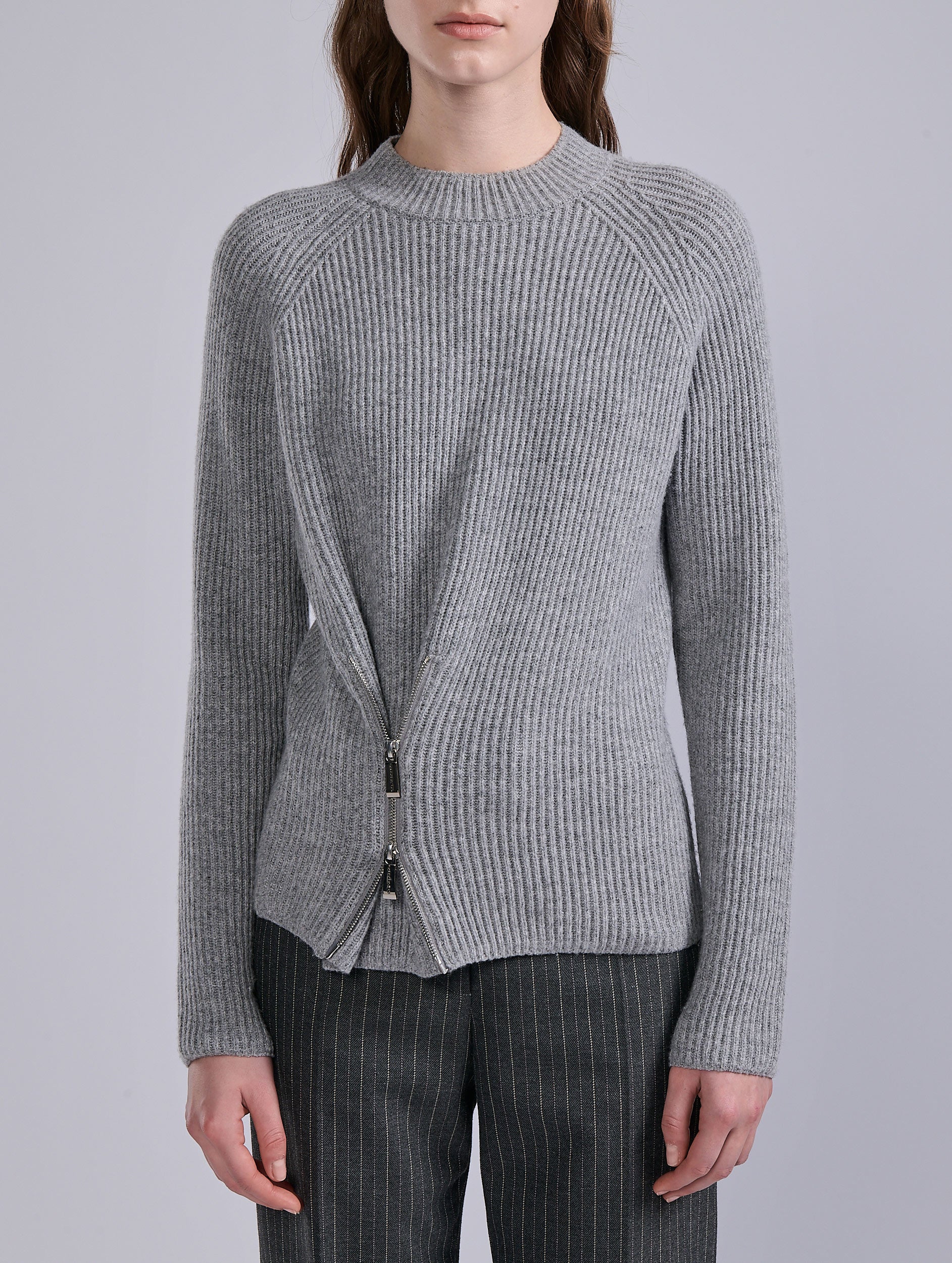 Zipped sweater in grey ribbed wool